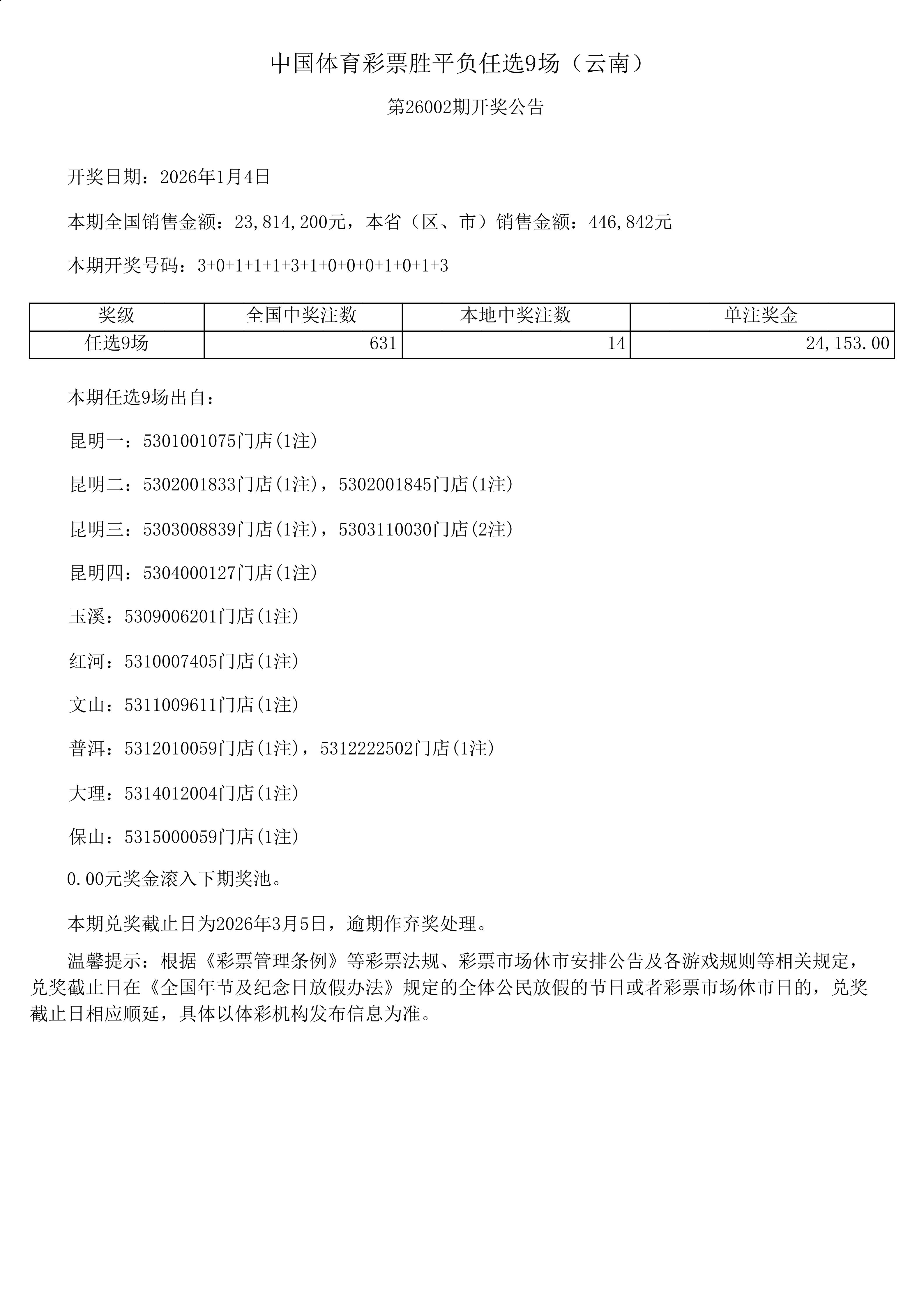 足球胜平负任选9场-26002期开奖公告