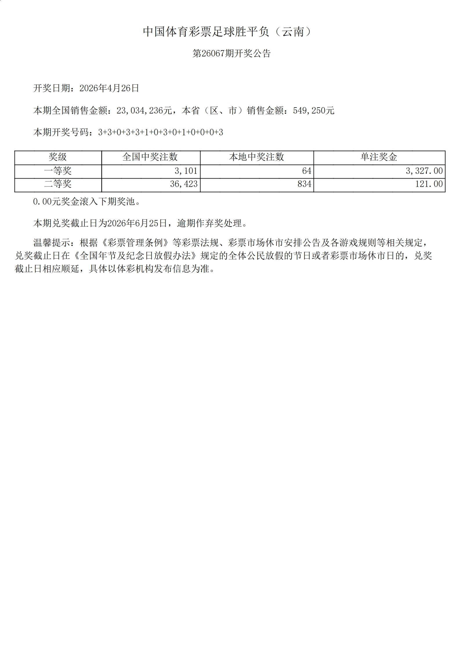 足球胜平负-26067期开奖公告