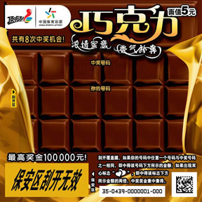 顶呱刮新票“巧克力”游戏规则:刮开覆盖膜,如果你的号码中任意一个号码与中奖号码之一相同,即中得该号码下方所示的金额;如果出现双心标志“ ”,即中得该标