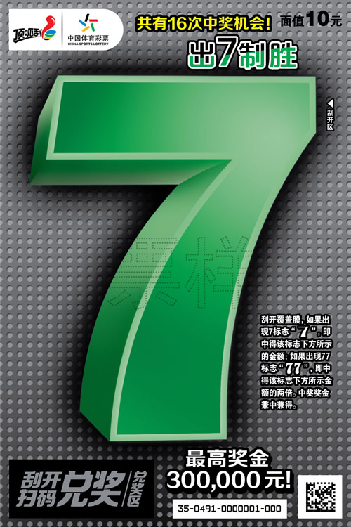 10元面值“动起来”:头奖30万 『出7制胜』面值10元,最高奖金30万元。刮开覆盖膜,如果出现7标志“7”,即中的该标志下发所示的金额;如果出现7