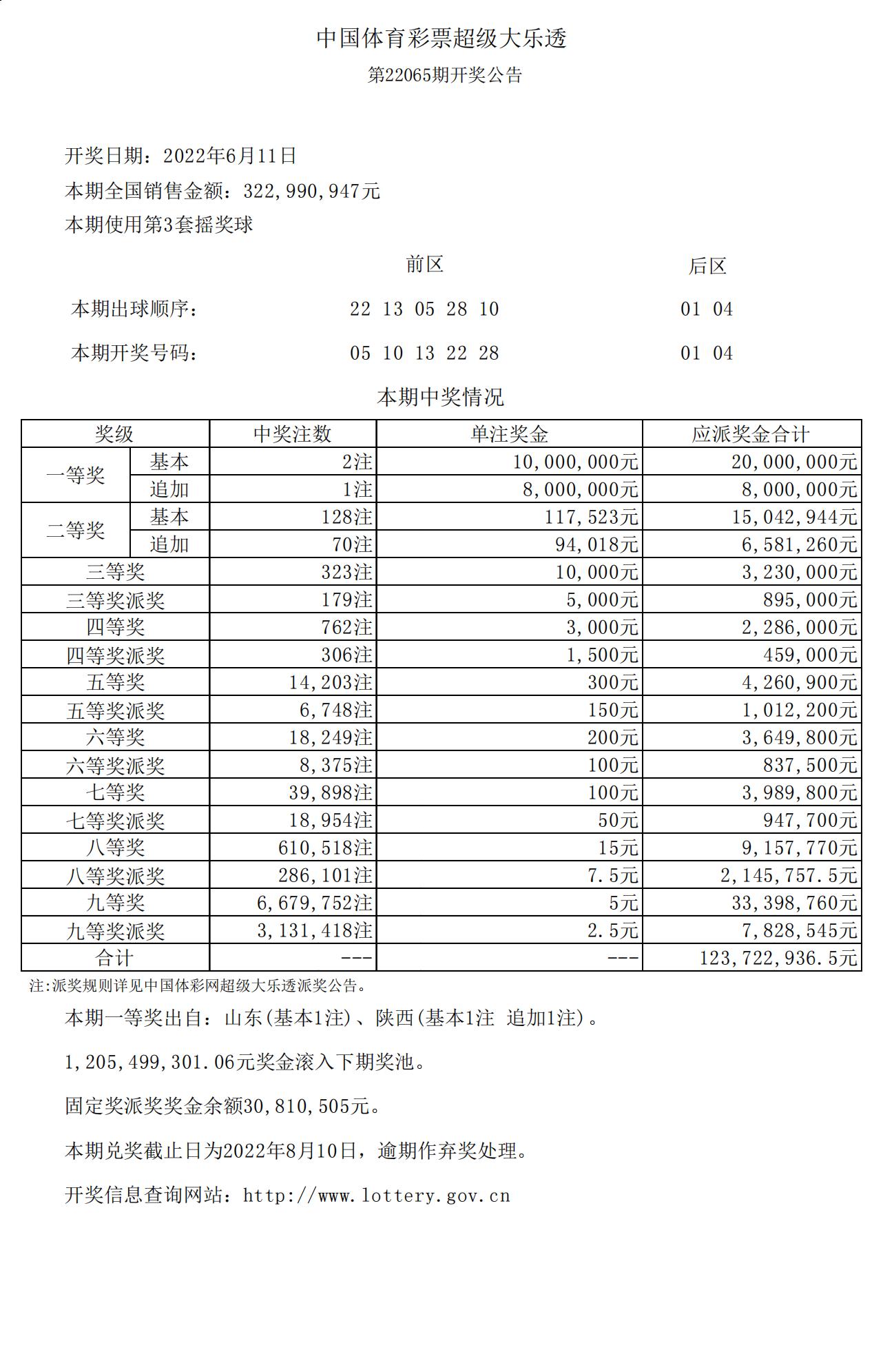 超级大乐透22065期开奖公告