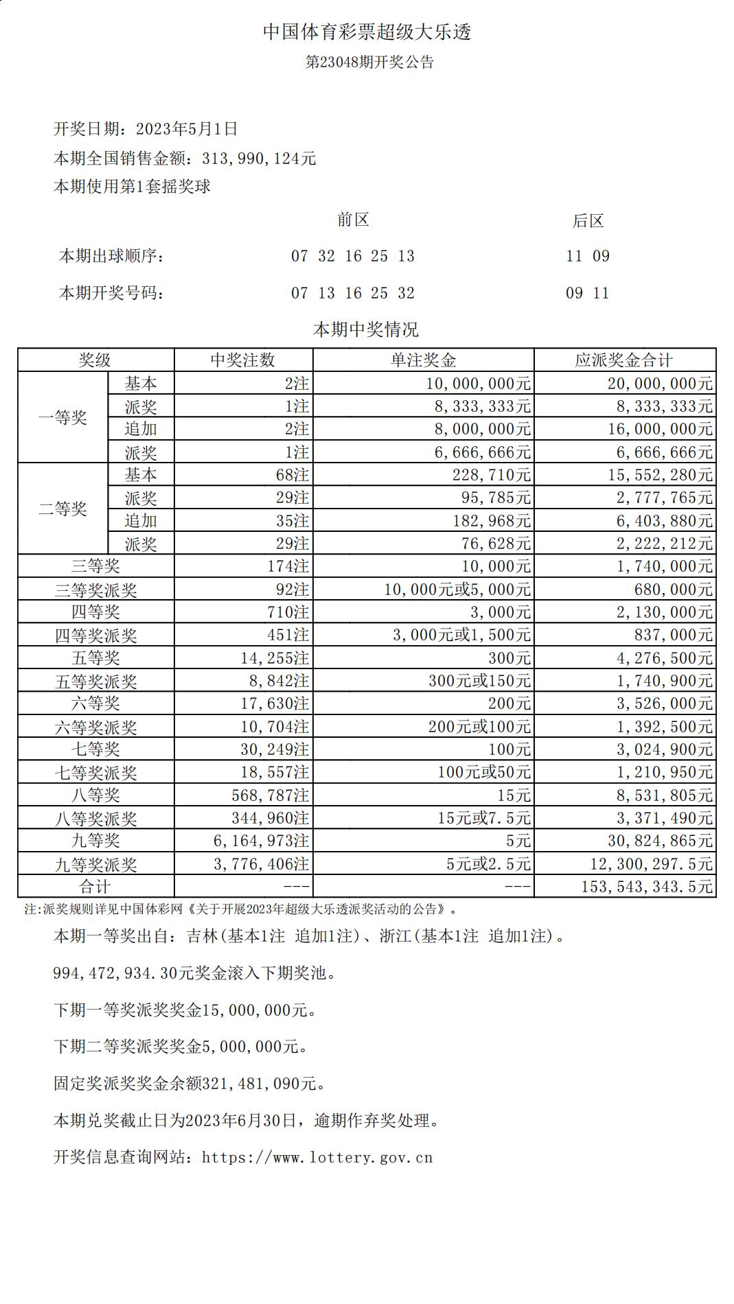 超级大乐透23048期开奖公告