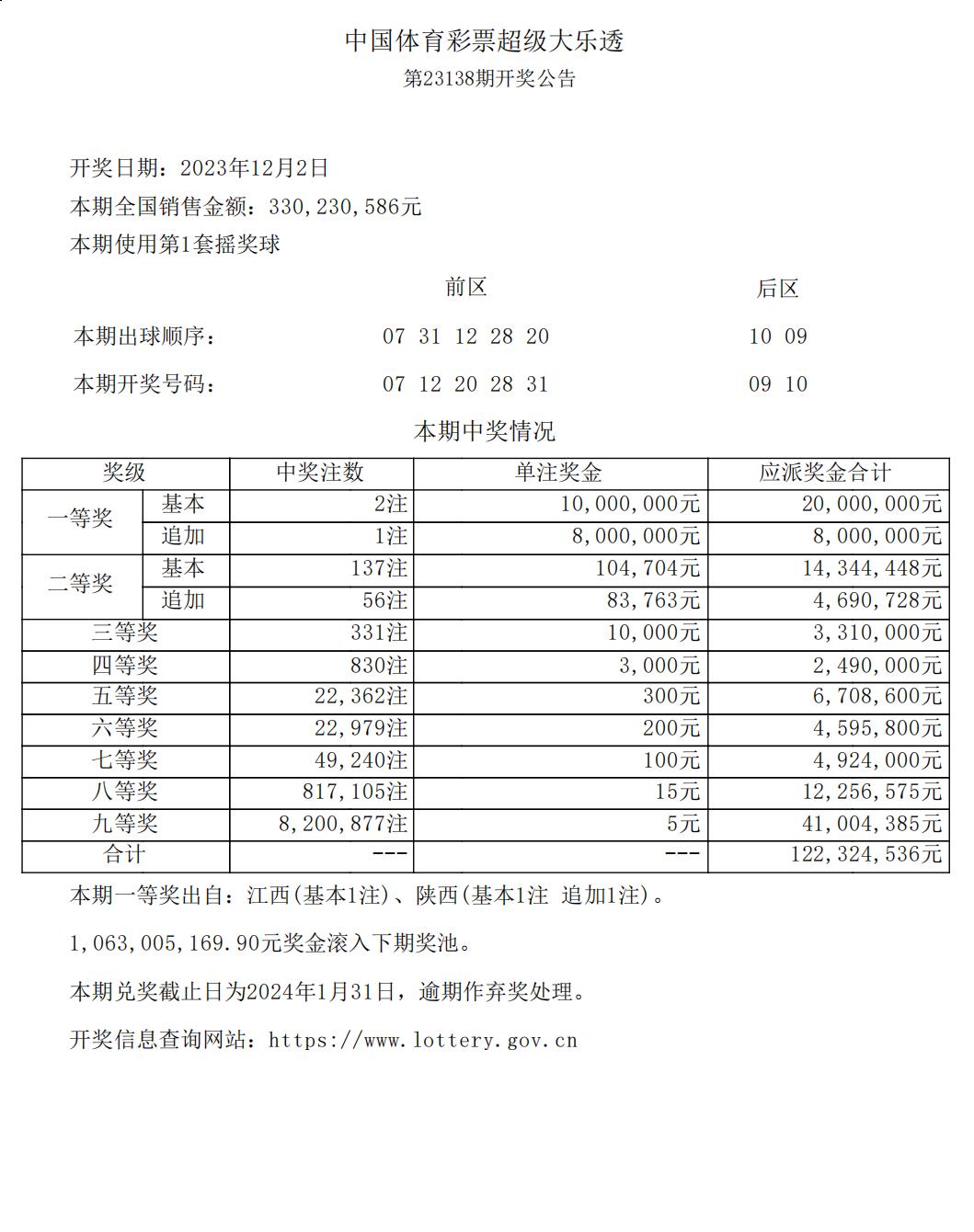 超级大乐透23138期开奖公告