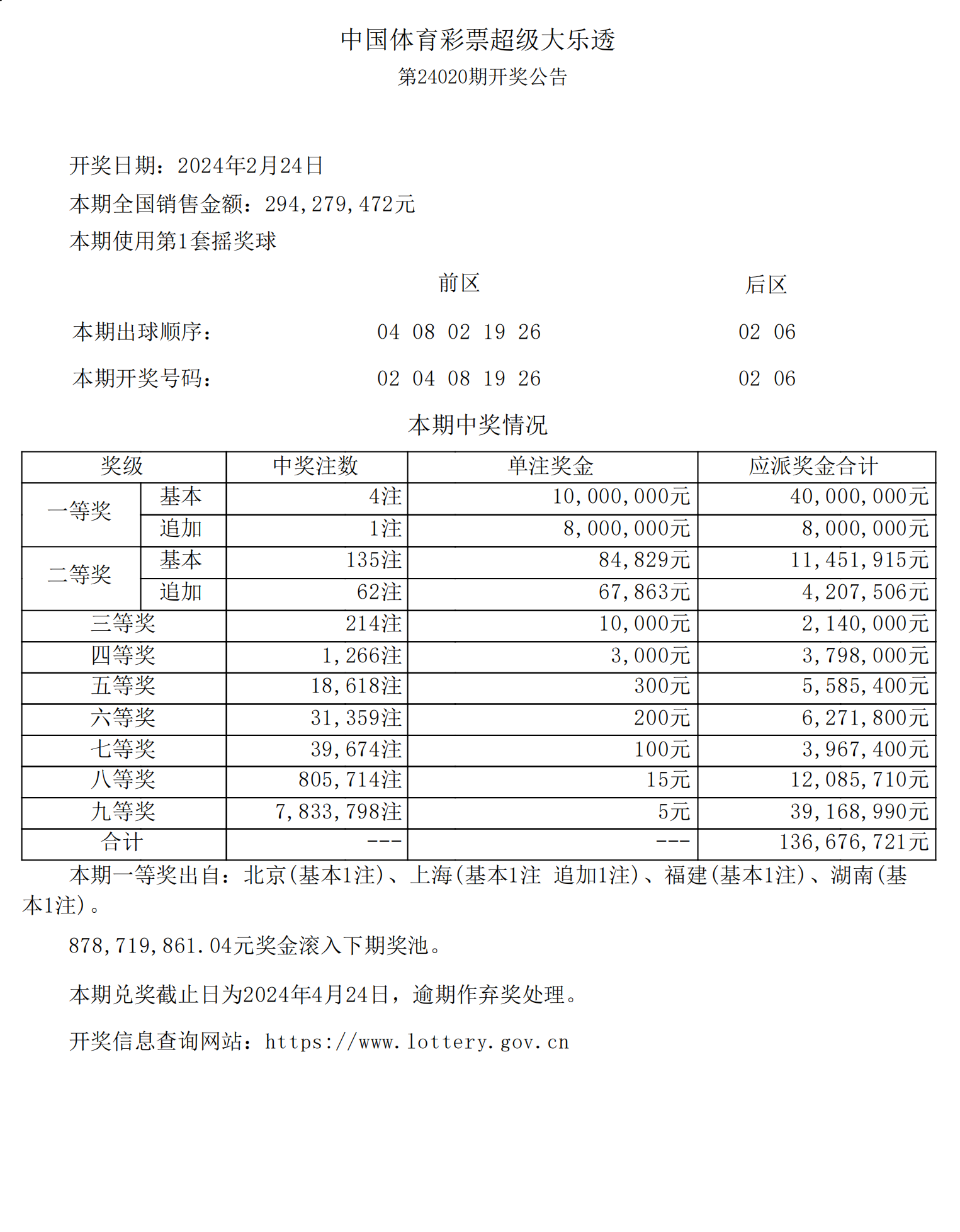 超级大乐透24020期开奖公告