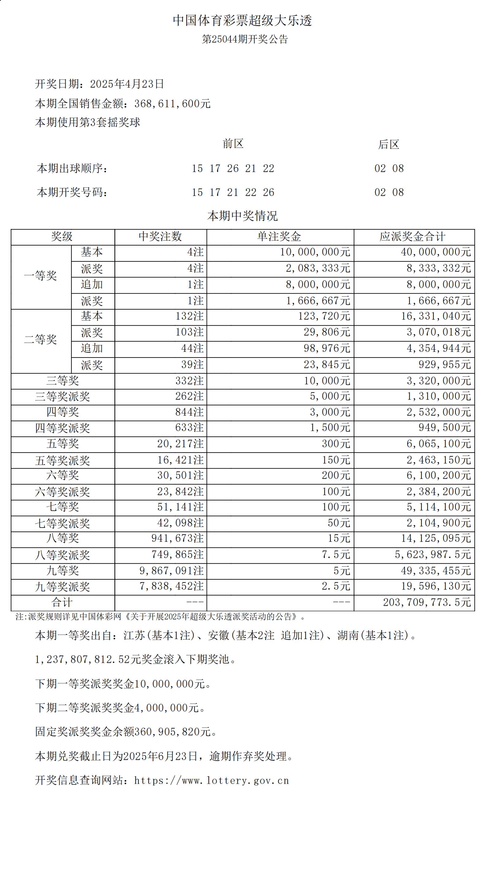 超级大乐透25044期开奖公告
