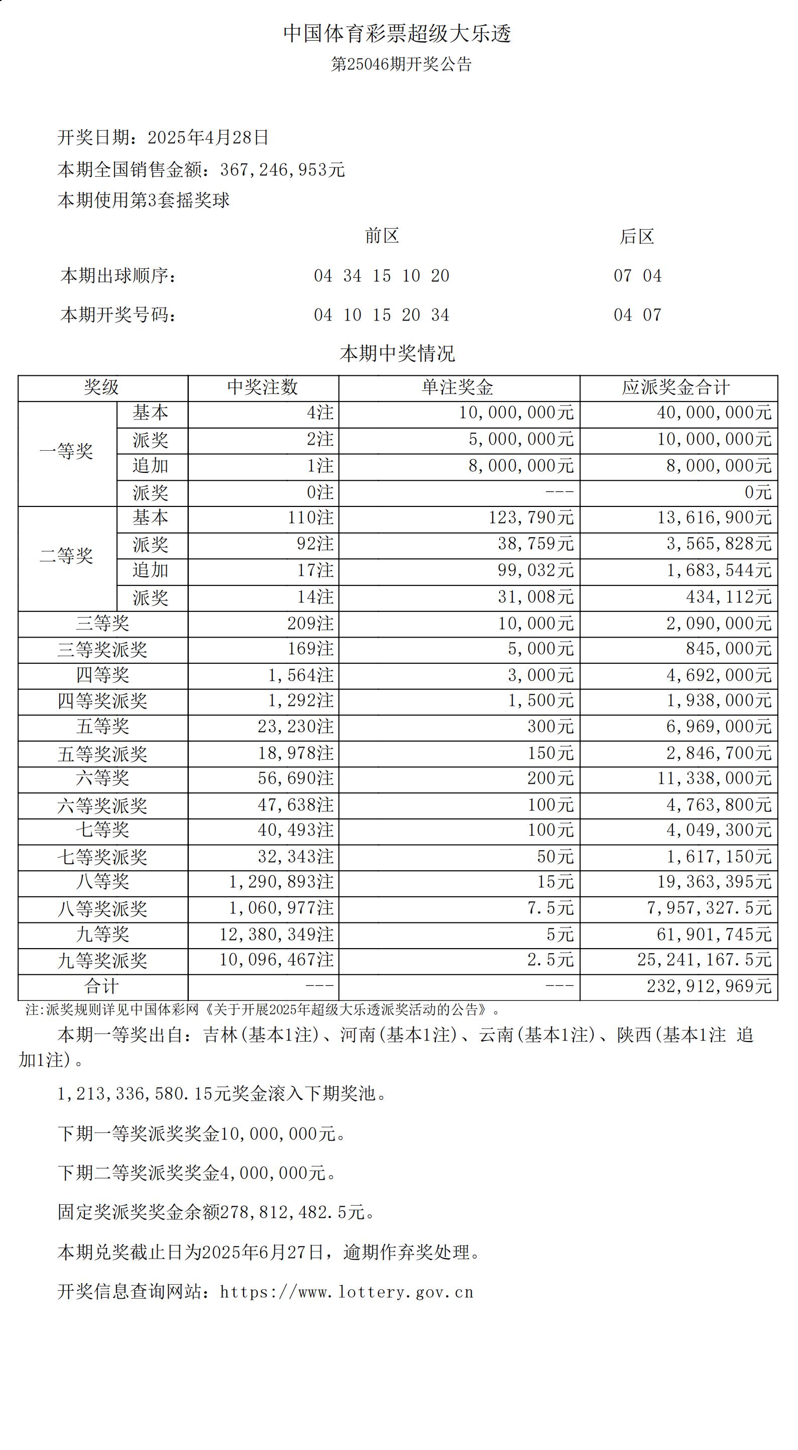 超级大乐透25046期开奖公告