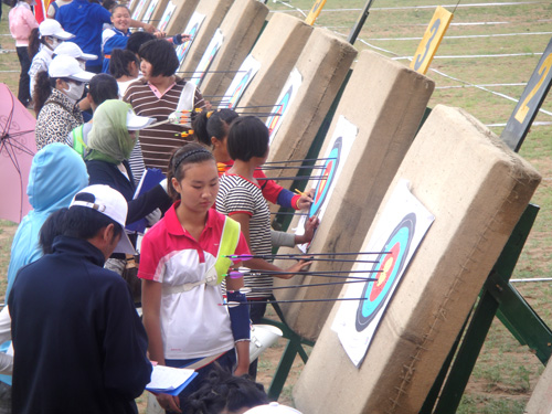 6月27日上午,2011年内蒙古自治区青少年“体彩杯”射箭锦标赛在锡林郭勒盟锡林浩特市赛马场隆重举行。来自全区11个代表队的200余名青少年选手,将在锡林郭勒大草原——北京奥运会拳击冠军张小平的故乡一展身手。在接下来的4天时间里,代表着内蒙古青少年射箭最高水平的小选手们,将争夺男女甲、乙、丙六个组别的冠军。在参赛选手中,年龄最大的不到20岁,而最小的只有15岁,未来的“草原神箭手”将会在他们之中产生。