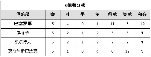 G组:巴萨一枝独秀 本菲卡出线形势严峻
