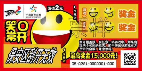 每年,中国体育彩票都会根据不同主题推出一些贴近生活的即开新票,像今年迎春贺岁的“竹报平安”和“吉祥如意”即开票,在衬托新年喜庆、寓意美好一年的同时,也让彩民们在一个充满喜庆的节日里感受到“顶呱刮”带来的更多快乐。本次“笑口常开”即开新票的上市,也是期望大家像票面名称一样高高兴兴地过好每一天,笑口常开面对生活百态。该票面图案由一个大笑脸和四个小笑脸组成,每个笑脸的表情风格迥异,非常喜乐。票种面值2元,最高奖金为15,000元。玩法规则更是非常简单,刮开覆盖膜,在任意一场游戏中,如果出现两个相同的标志,即中得该场游戏右方所示的金额,兼中兼得。