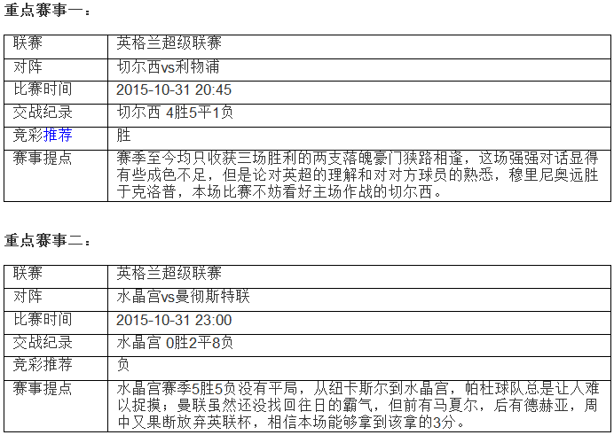 利物浦在克洛普走马上任之后收获三连平,并没有收到“换帅如换刀”的奇效,直到本周中的英联杯才收获首胜。克洛普的执教能力和个人魅力毋庸置疑,但他在多特蒙德的战术体系是完全建立在速度之上的,利物浦目前的人员配置与多特有明显差异,尤其是中前场缺少速度型球员,如何为现在的利物浦打造一套适合的战术体系,还要费一番脑筋。此外,精神领袖亨德森长期养伤,防守端短期内也无法取得质的飞跃。应该看到,克洛普的到来给红军带来了久违的乐观和激情,物浦的人员配置在英超属一流水平,即使战术体系一时无法磨合到位,利对付中下游球队还是绰绰有余,但是本周末挑战英超经验远胜自己的穆里尼奥,利物浦的还是处于明显下风位置。