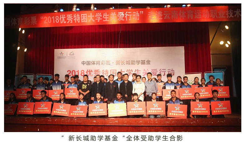 2017年,云南体彩首次举办“中国体育彩票·新长城助学基金”活动,向云南林业职业技术学院20名特困学生。今年,云南体彩加大了活动力度,在云南体育运动职业技术学院、云南师范大学两所高校捐助110名优秀特困大学生,其中向云南体育运动职业技术学院捐助50名学生,向云南师范大学捐助60名学生,帮助他们顺利完成学业。