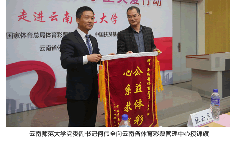 11月29日,由国家体育总局国家体育彩票管理中心、中国扶贫基金会、云南省体育彩票管理中心主办的“中国体育彩票·新长城助学”活动走进云南师范大学,在云南师范大学体育学院举行了捐助仪式。