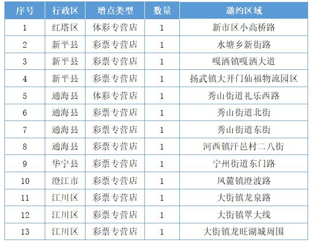 根据“2019年渠道拓展与规范管理工作实施方案”中新增网点内容要求和《云南省体育彩票销售网点管理办法》的相关法规及政策,结合玉溪体彩市场的实际情况,在坚持以市场为导向,遵循统筹规划、合理布局的原则下,经重大会议研究决定:在玉溪市共规划9个区域,新增13名体育彩票代销者。具体公告如下: