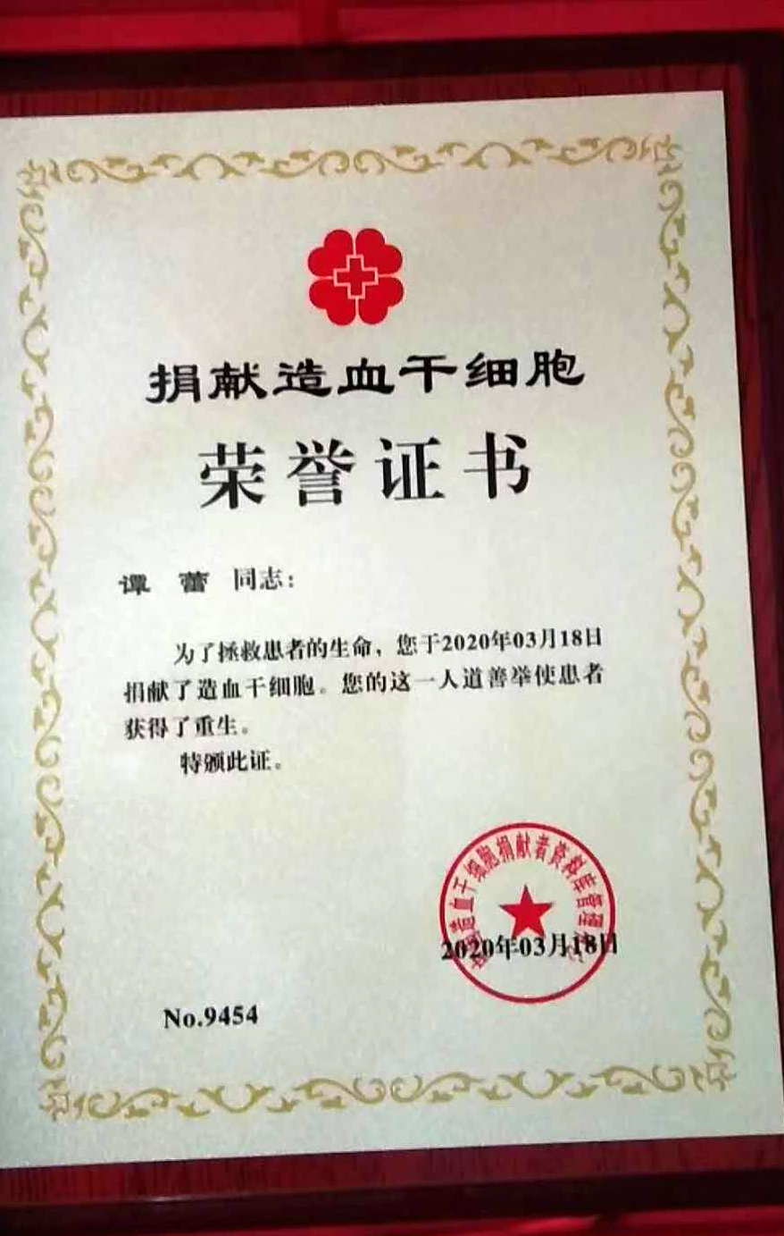 当月,湖南体彩授予谭蕾“大爱体彩人”荣誉称号。不过,谭蕾并不觉得自己做了件了不起的事,“举手之劳吧!我加入中华骨髓库的初心,就是希望有朝一日能帮到别人。2014年就与一位血液病患者初步配型成功,可惜最终未能捐献,当时还挺遗憾的。想不到5年后再次有人配型成功,终于顺利捐献了。”谭蕾说:“如果今后还能配型成功,我还会接着捐。”