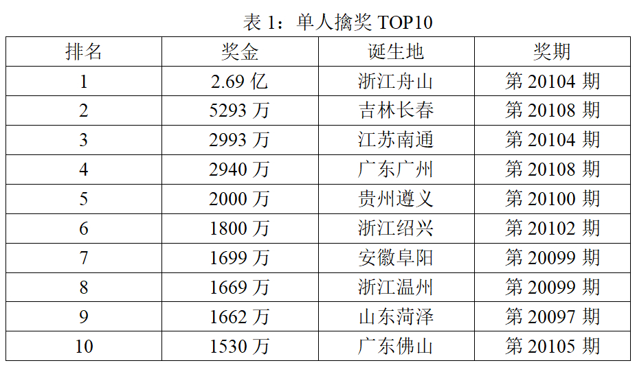 10月份,体彩大乐透累计中出112注一等奖,其中26注为1000万元及以上大奖,平均每注奖金913万元。单人最高擒奖2.69亿元,单注最高奖金1800万元。