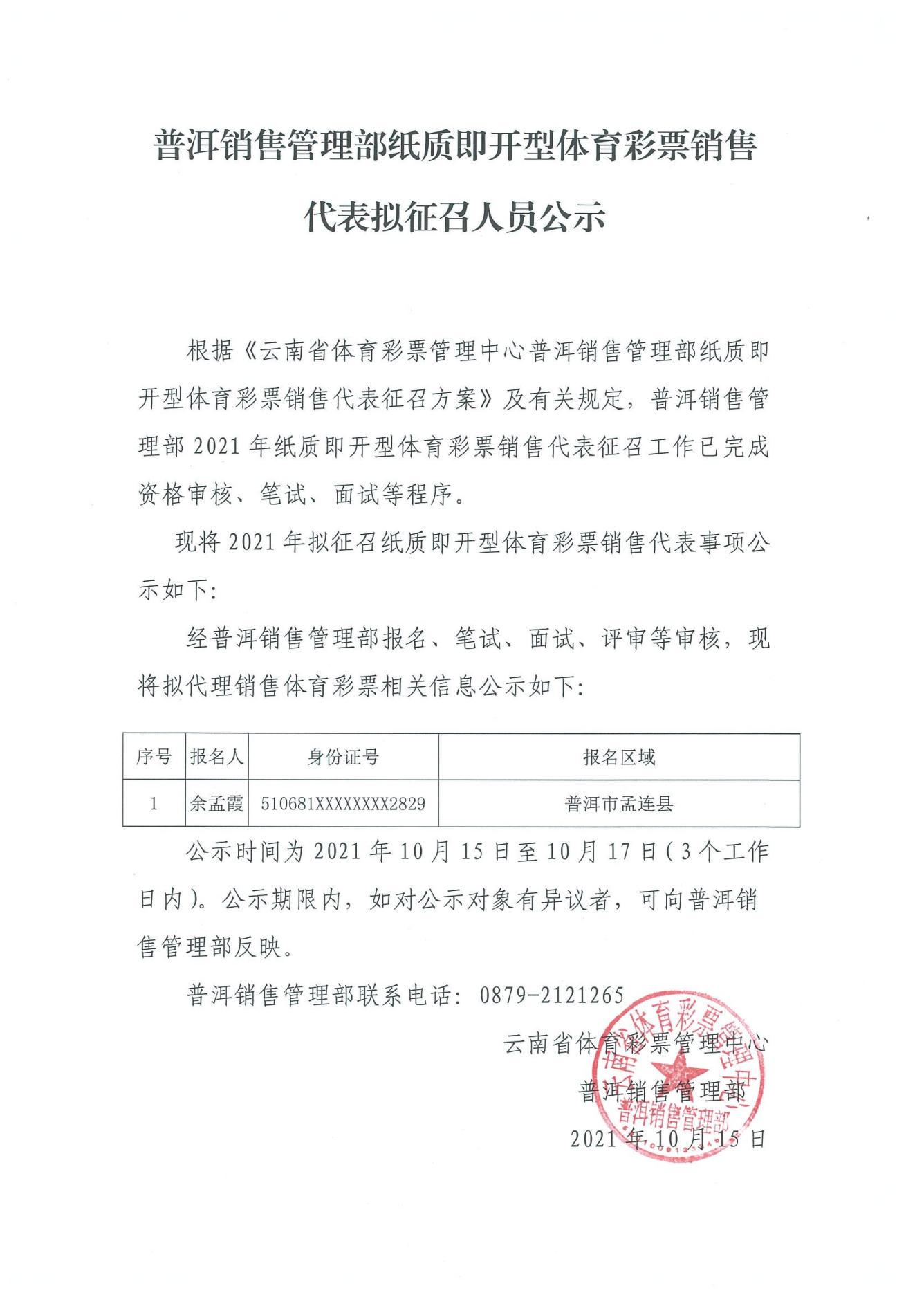 普洱销售管理部纸质即开体育彩票销售代表拟征召人员公示