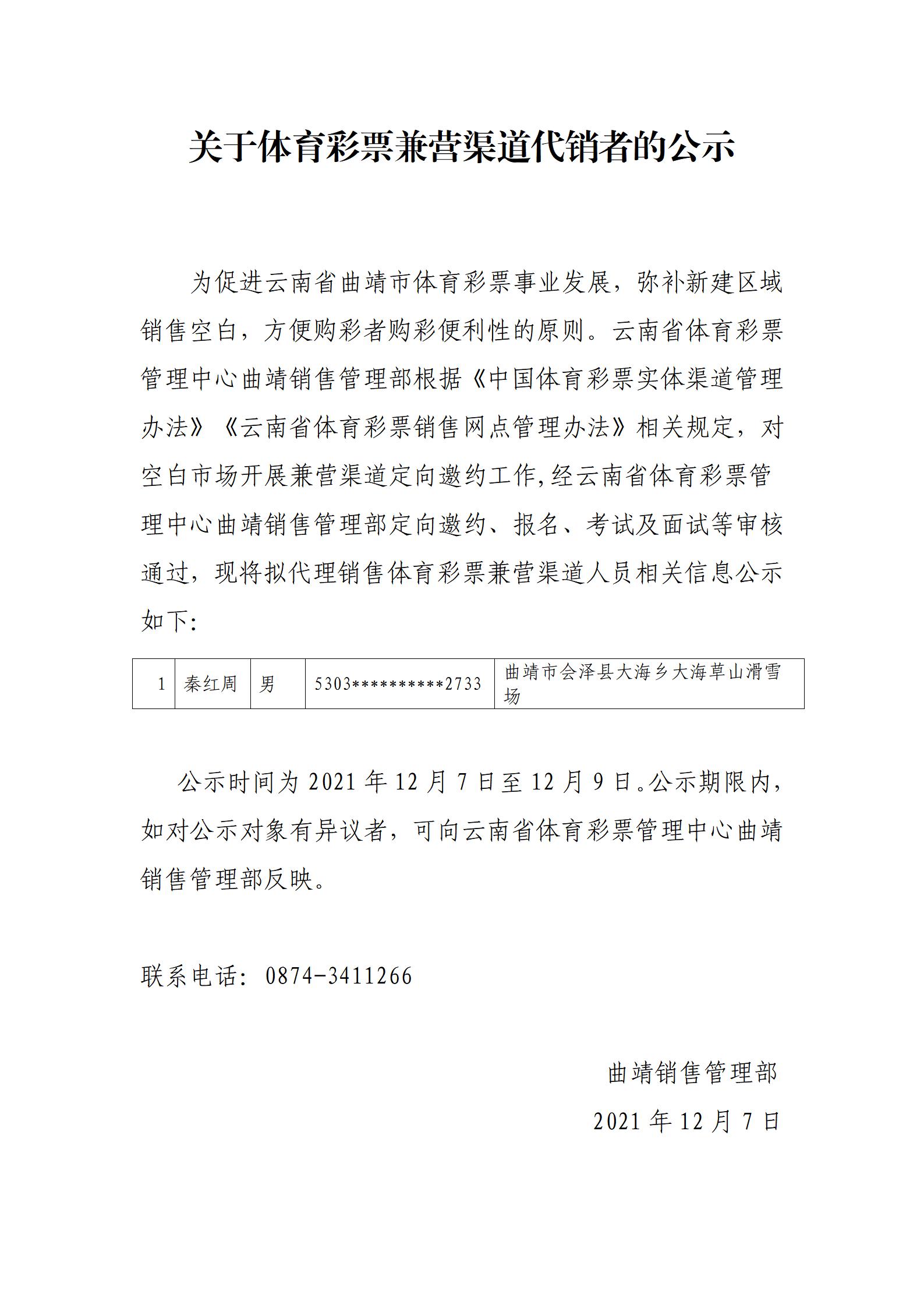 曲靖销售管理部关于体育彩票兼营渠道代销者的公示