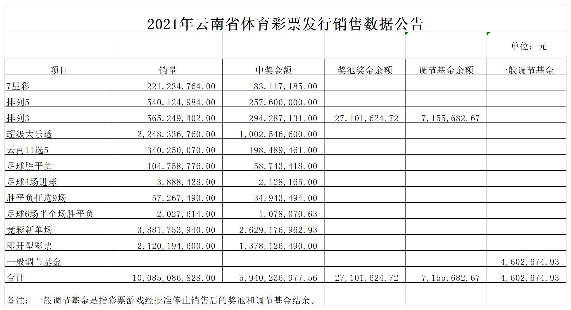 根据《彩票管理条例》(国务院令第554号)、《彩票管理条例实施细则》(财政部 民政部 国家体育总局令第67号)和《财政部关于贯彻落实<彩票管理条例实施细则>的通知》(财综[2012]6号)的有关规定,现就体育彩票各游戏2021年度销售数据公告如下:
