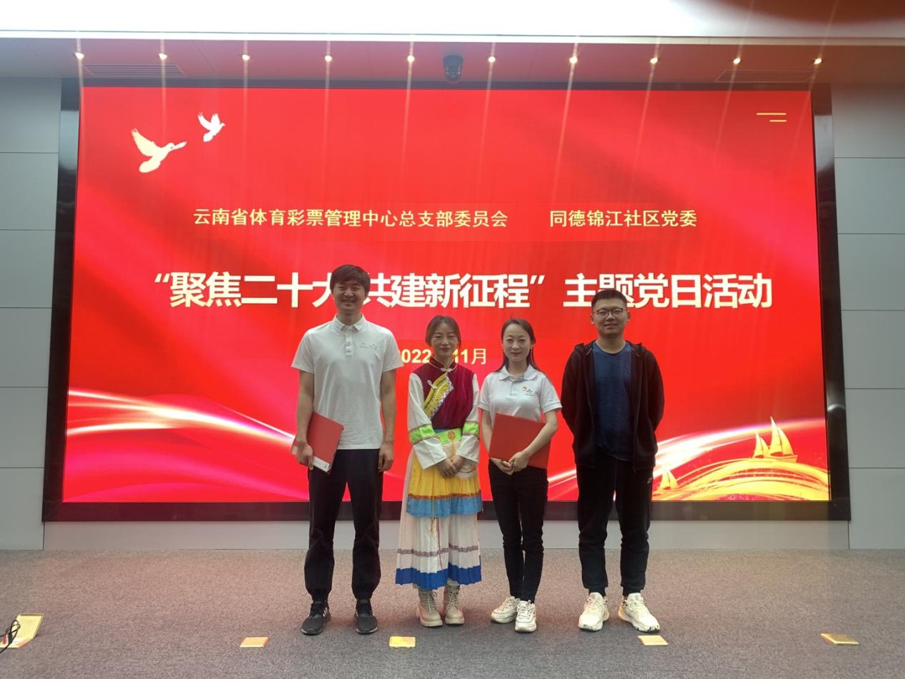 活动开场体彩中心副主任周帅同志作了致辞,对社区在文明单位创建、志愿服务活动等工作中给予的支持和帮助表示感谢。接着,体彩中心王诗雨、聂栋、杨阳三位同志为大家演绎情景剧《云南高原上绽放的格桑梅朵》,讲述了荣获“2020体彩追梦人”称号的原迪庆销售管理部主任李永琴“平凡铸就伟大·奋斗筑梦未来”的故事,综合管理党支部张寅同志声情并茂作了《不忘初心再出发 踔厉奋发无穷期 》的演讲,讲述了罗炳辉将军从奴隶到将军和德宏瑞丽体育彩票销售员王海英积极投身抗疫的故事,彰显着中国共产党人无私奉献和勇于牺牲的品格。主题党日活动在二十大报告知识小竞答环节中推向高潮,党员同志们铆足精神踊跃抢答,活动气氛十分热烈,最后大家合影留念。