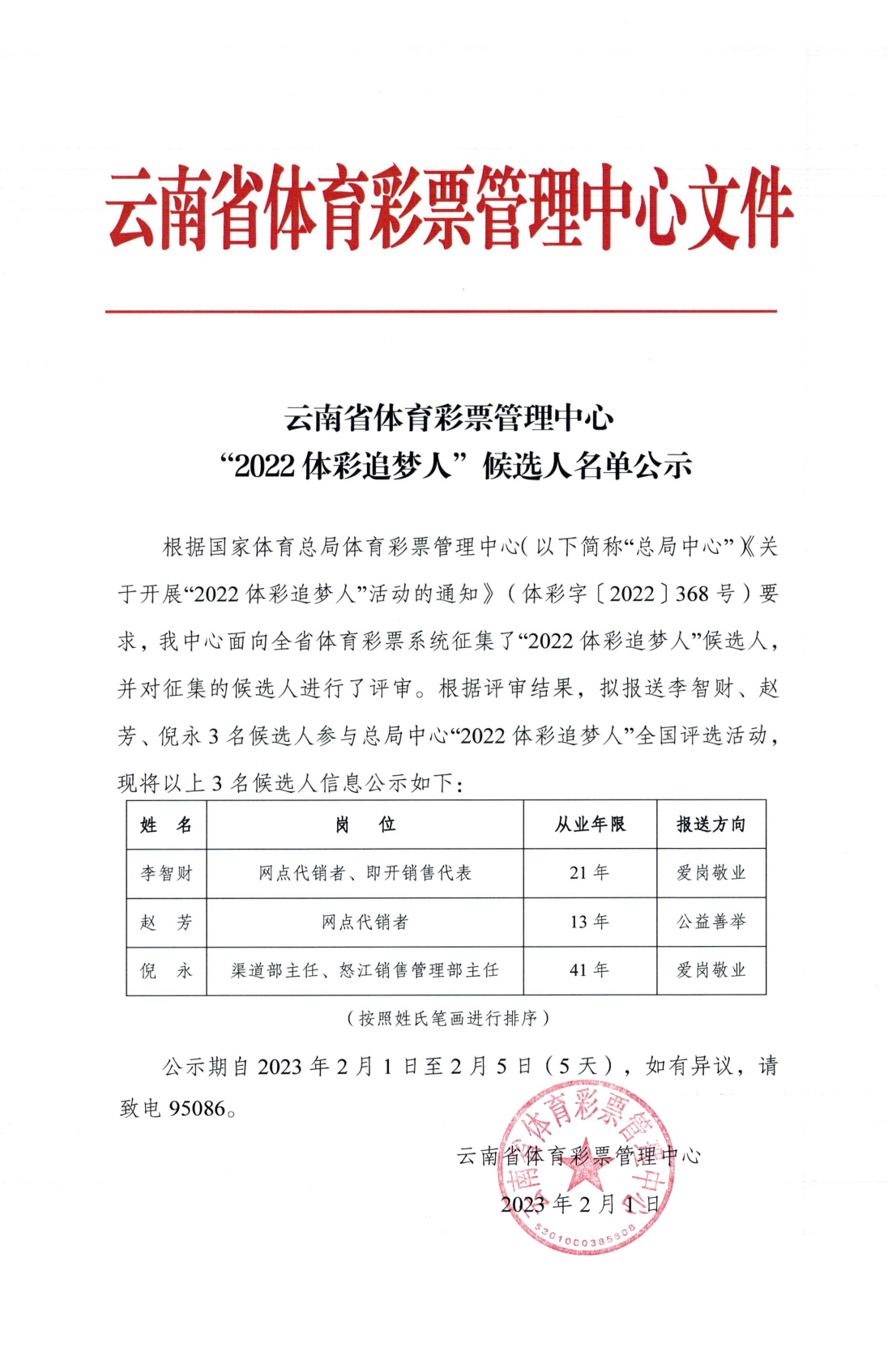 云南省体育彩票管理中心“2022体彩追梦人”候选人名单公示