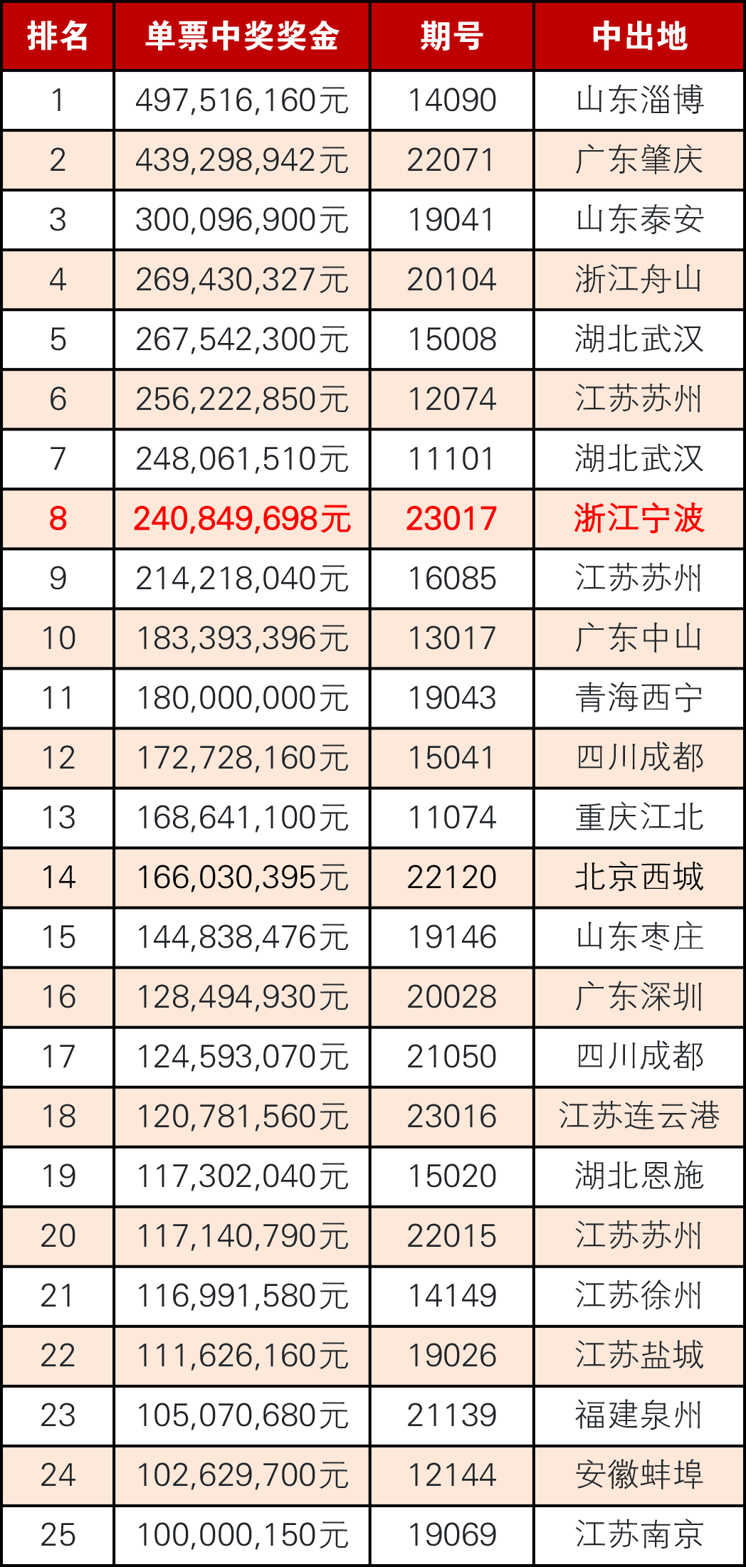此次2.4亿元大奖是超级大乐透2023年爆出的第二个亿元大奖,也是历史上中出的第25个亿元大奖,排名第8位。