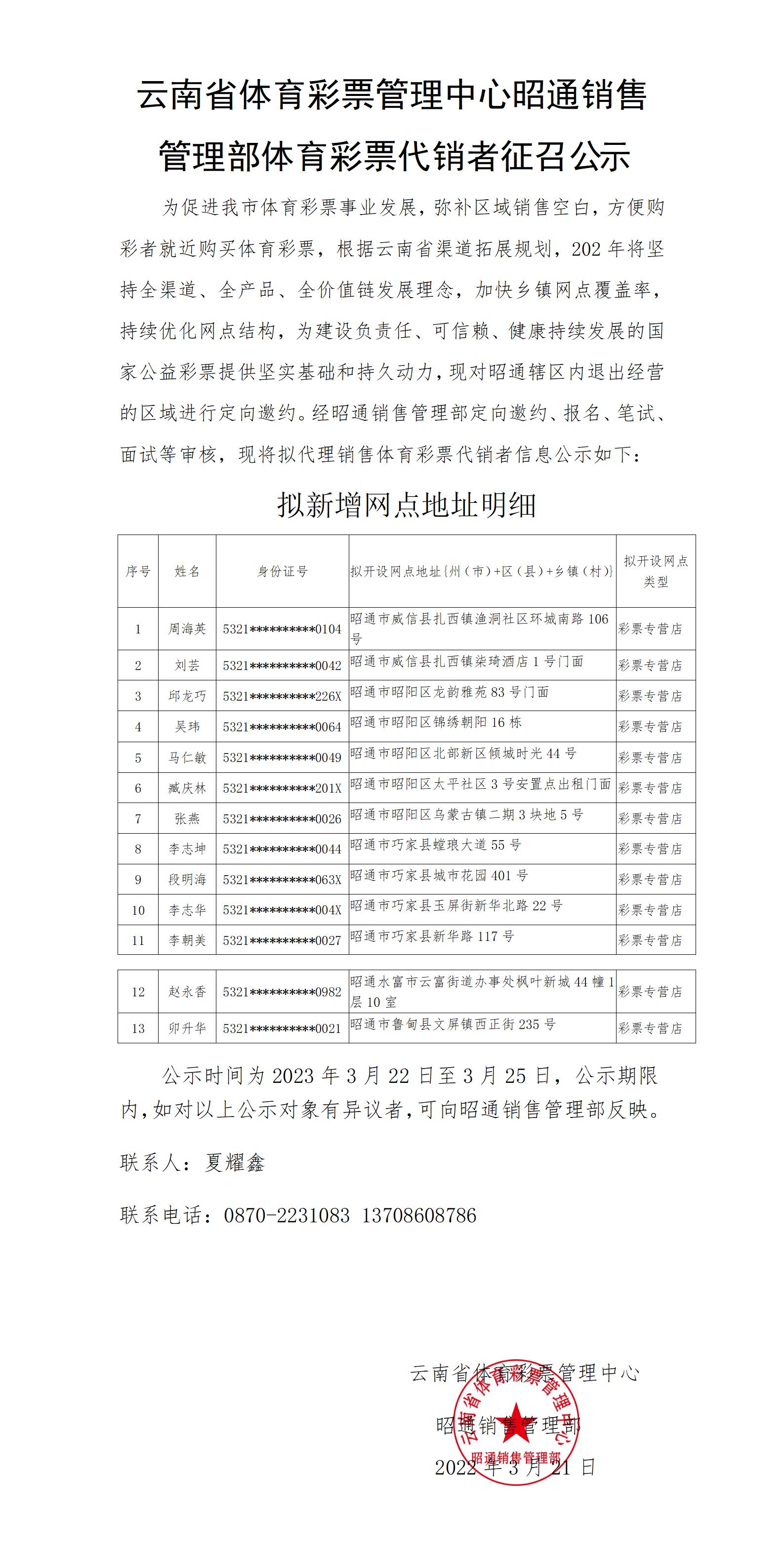 云南省体育彩票管理中心昭通销售管理部体育彩票代销者定向征召公示