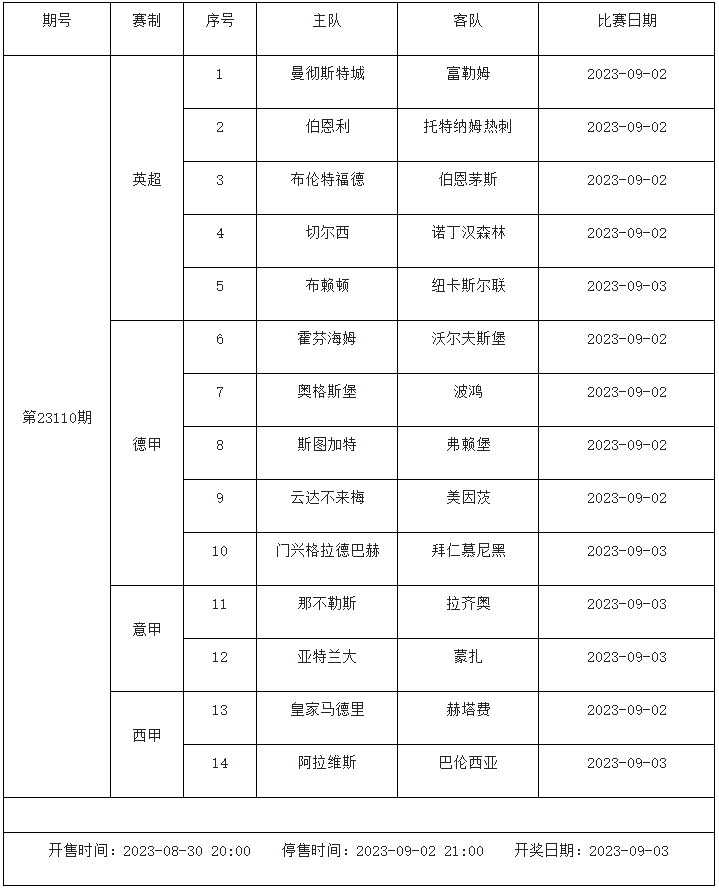 足球彩票胜负游戏(14场和任选9场)第23110期赛程: