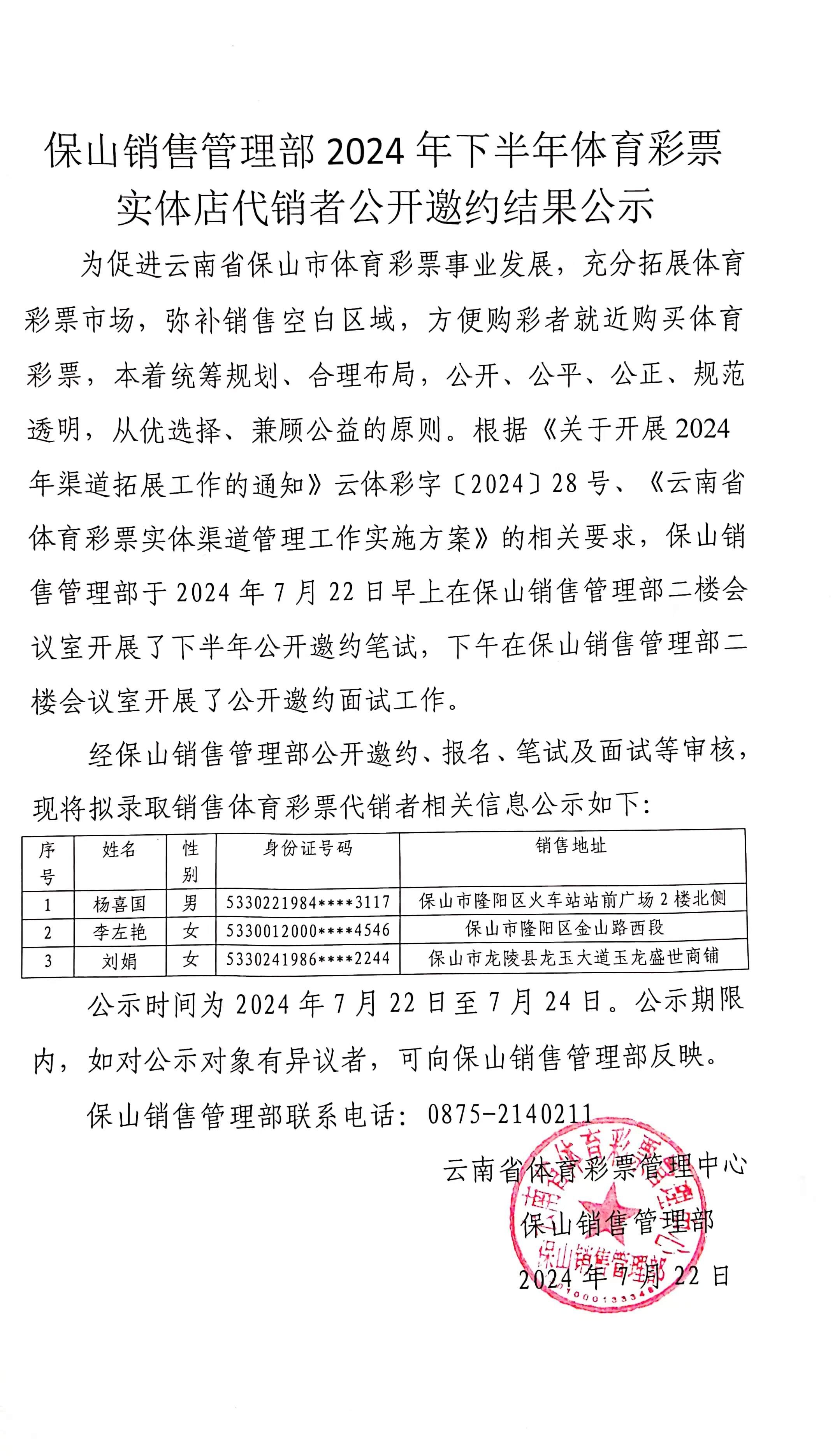 保山销售管理部2024年下半年体育彩票实体店代销者公开邀约结果公示