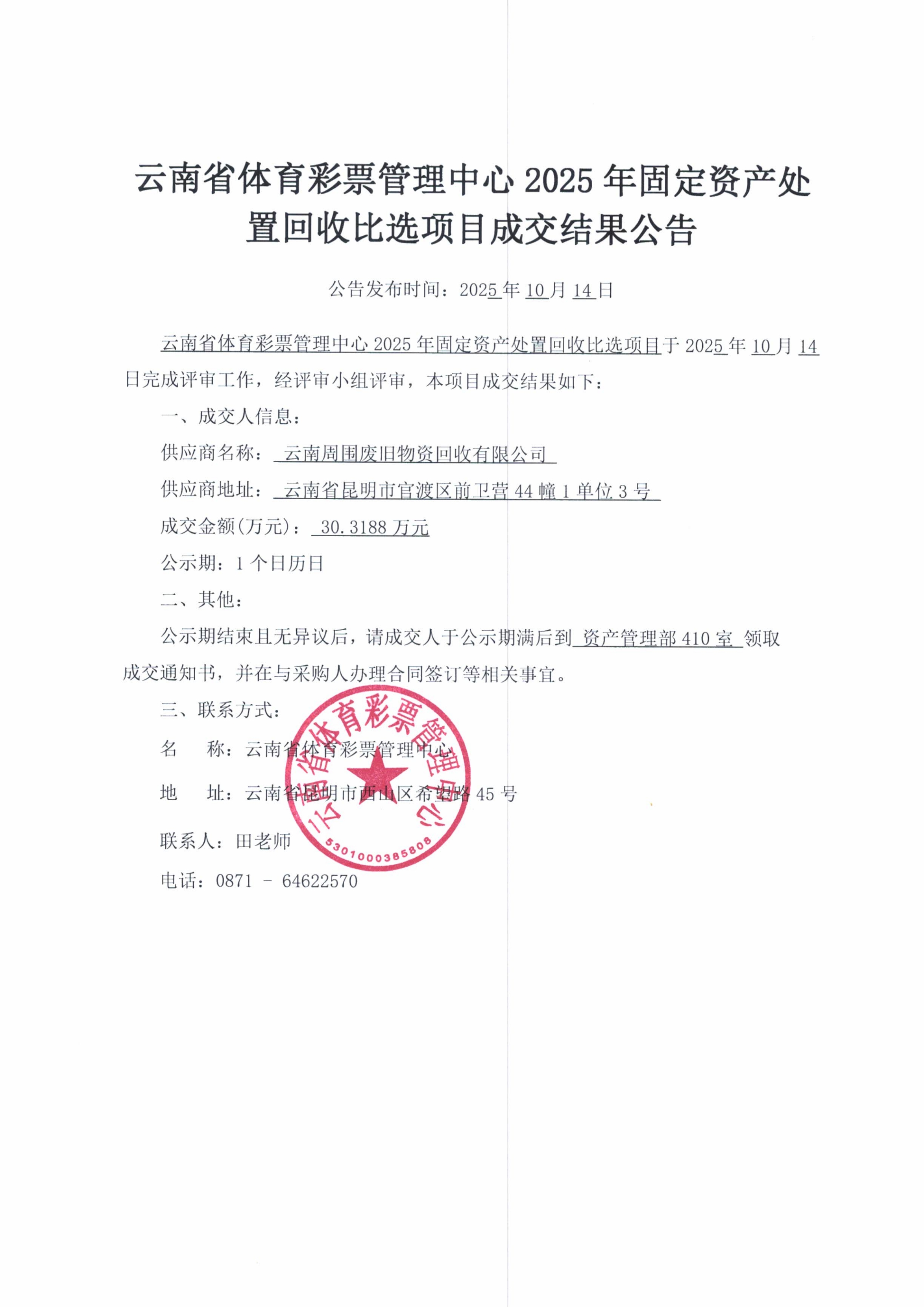 云南体彩2025年固定资产处置回收比选项目成交结果公告