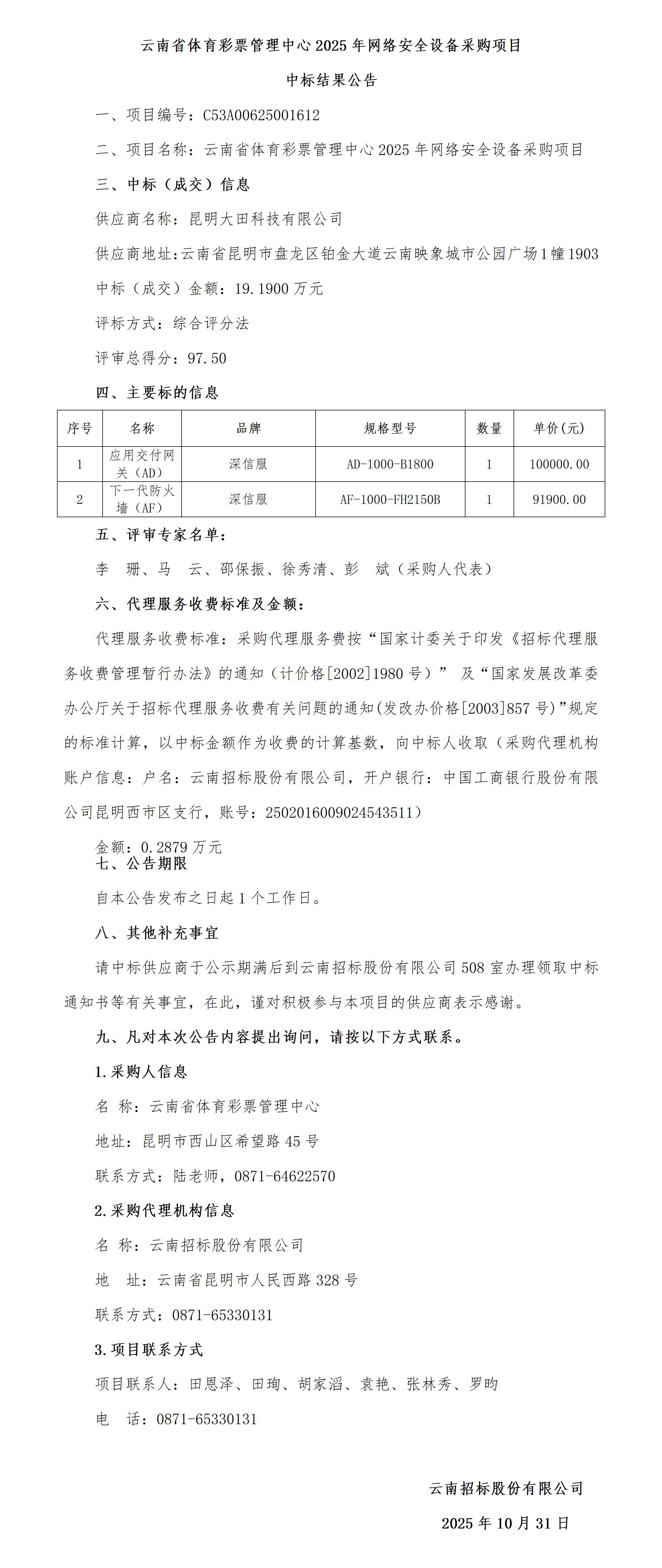 云南省体育彩票管理中心2025年网络安全设备采购项目中标结果公告
