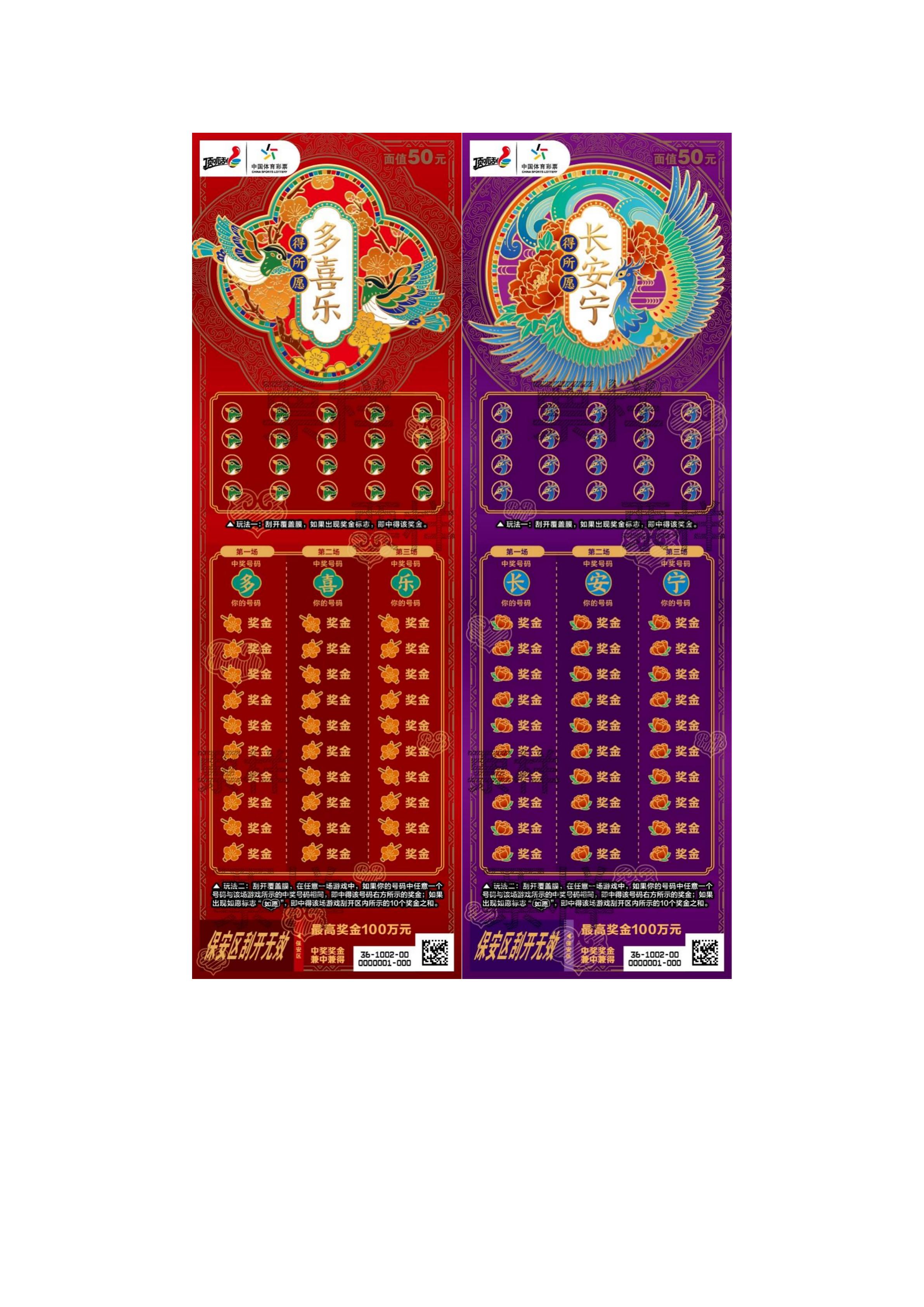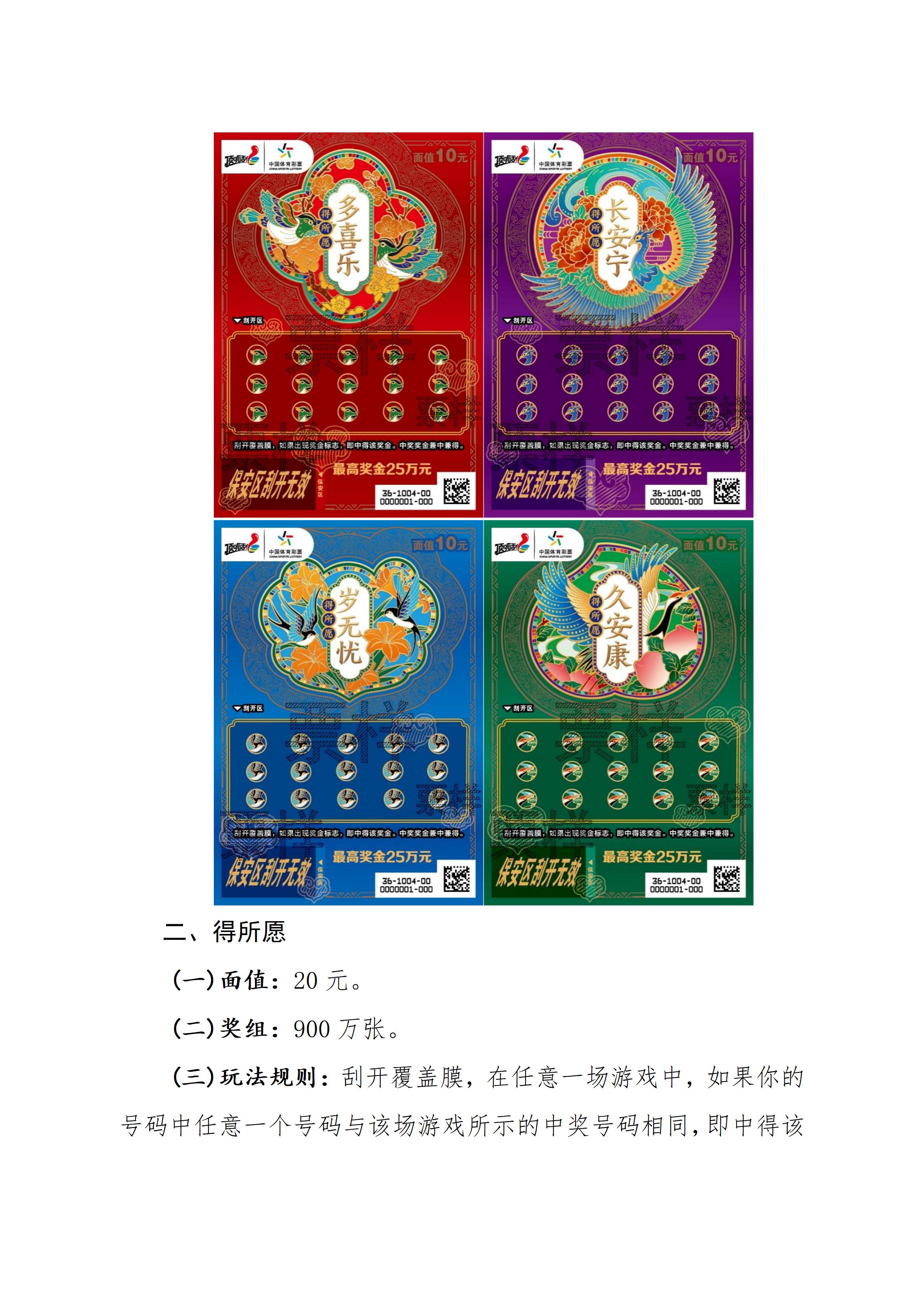 根据《财政部关于“为中国力量加油 雪舞龙腾”等14款即开型体育彩票游戏的审批意见》(财综〔2025〕36号)的要求,我中心将于2025年11月上市“得所愿”3款即开型体育彩票游戏,具体如下:10元“得所愿”、20元“得所愿”、50元“得所愿”。