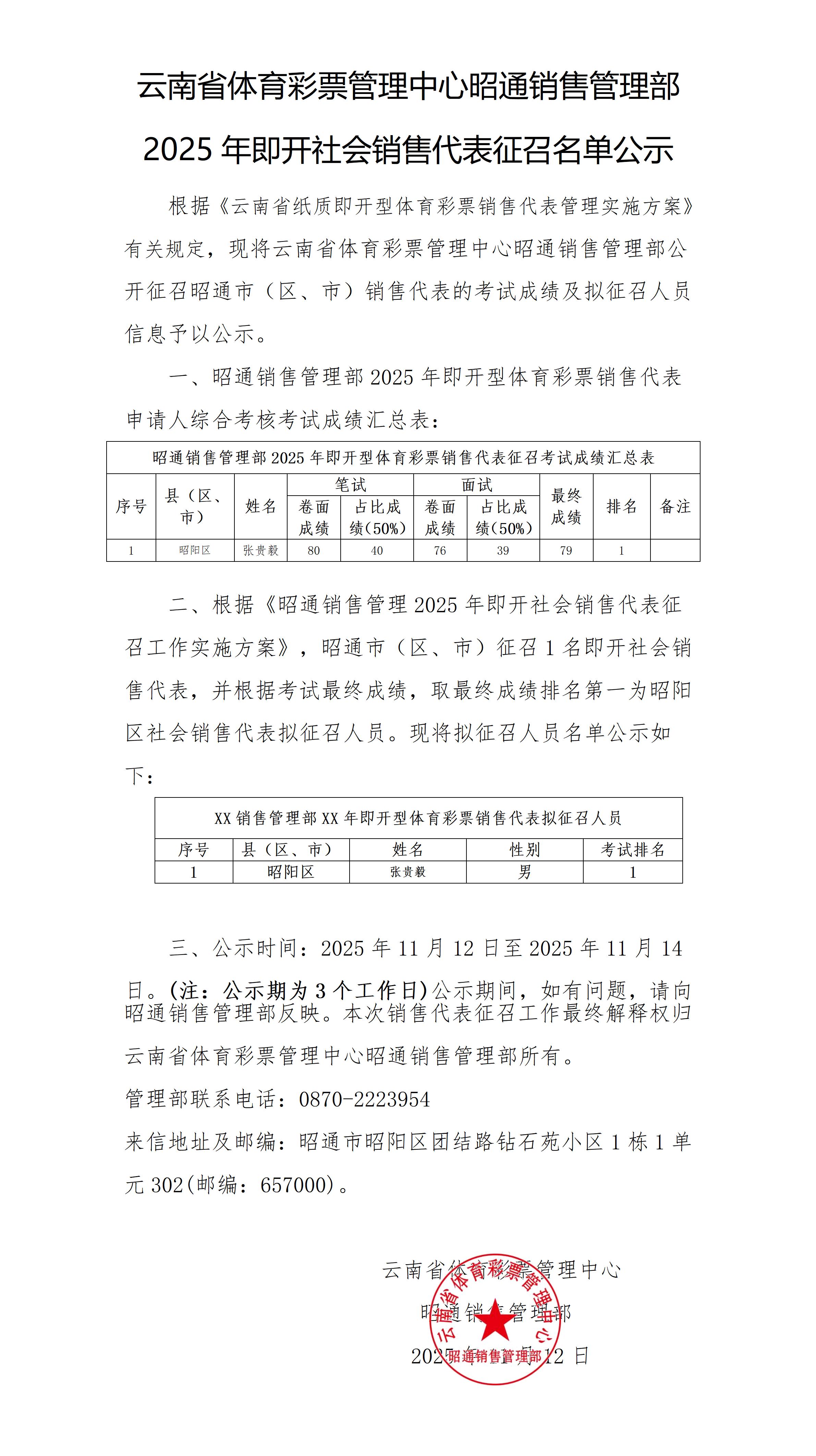 昭通销售管理部2025年即开型体育彩票社会销售代表公示