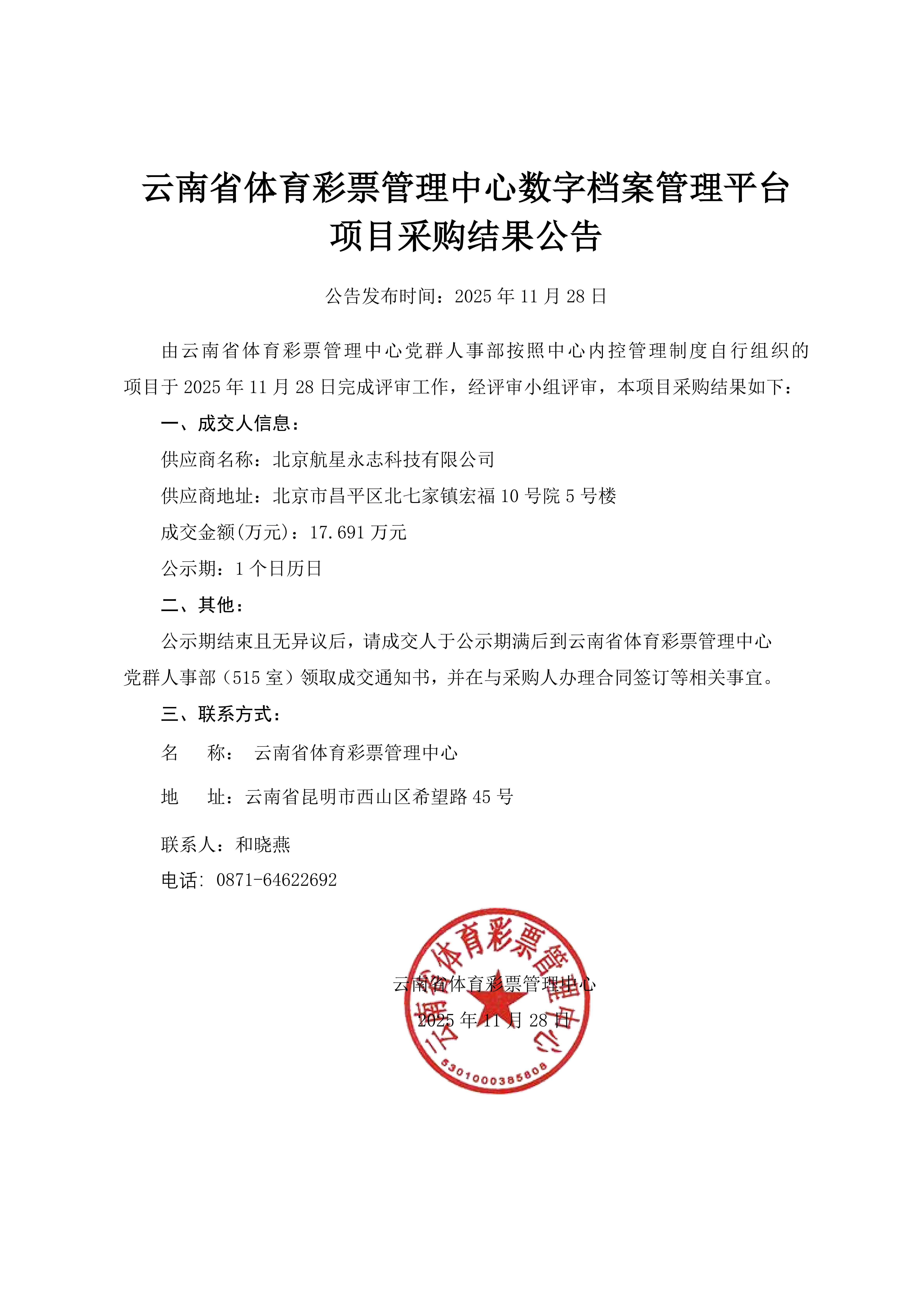 云南体彩数字档案管理平台项目采购结果公告