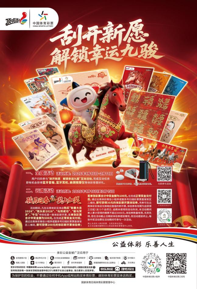 开工第一月,能量告急?云南体彩“骏马迎春 奖上加奖”活动,为你注入开年“马”力!即日起至2026年3月15日,购指定马年即开票,中奖后扫码立刻加送体验券,让你的好运直接加码。五款马年票,总有一款“马”住你心!