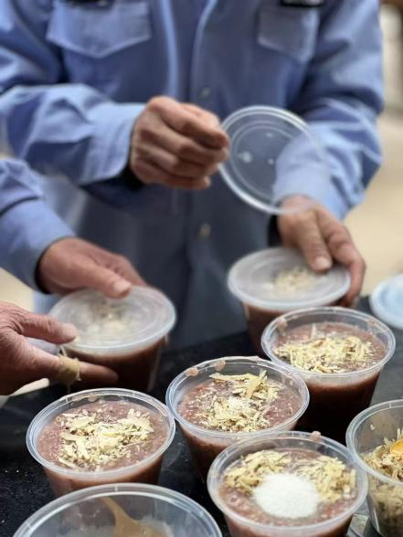 一位环卫工人接过热粥,脸上洋溢着朴实的笑容说道: “每年腊八都能喝到他们家的粥,喝完身上暖了,心里更暖。”保安和环卫工人是城市运行的“隐形守护者”,却常常在严寒中最容易被忽视。一碗热粥,暖胃更暖心,是对一线劳动者最真挚的敬意与感谢。