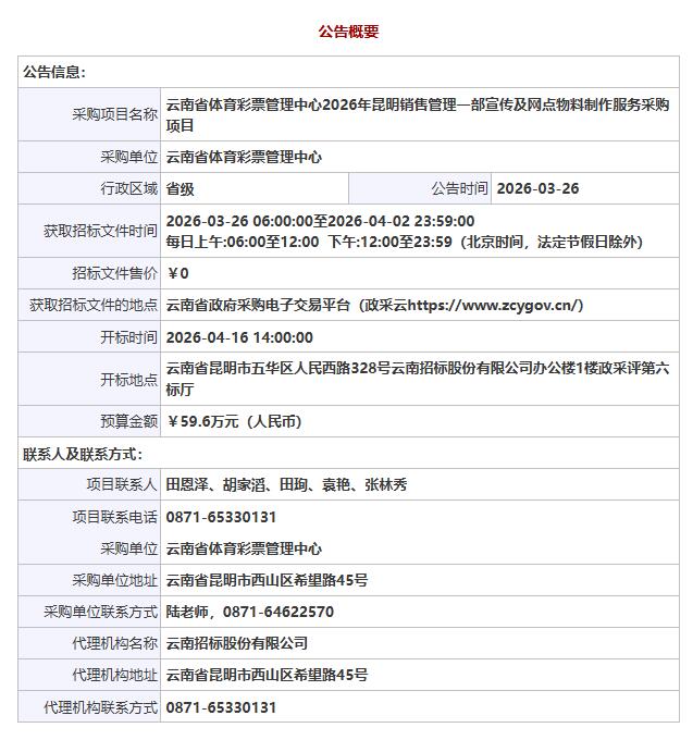 公告链接:云南省体育彩票管理中心2026年昆明销售管理一部宣传及网点物料制作服务采购项目公开招标公告