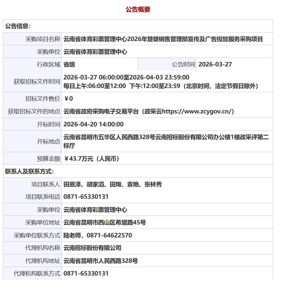公告链接:云南省体育彩票管理中心2026年楚雄销售管理部宣传及广告投放服务采购项目公开招标公告