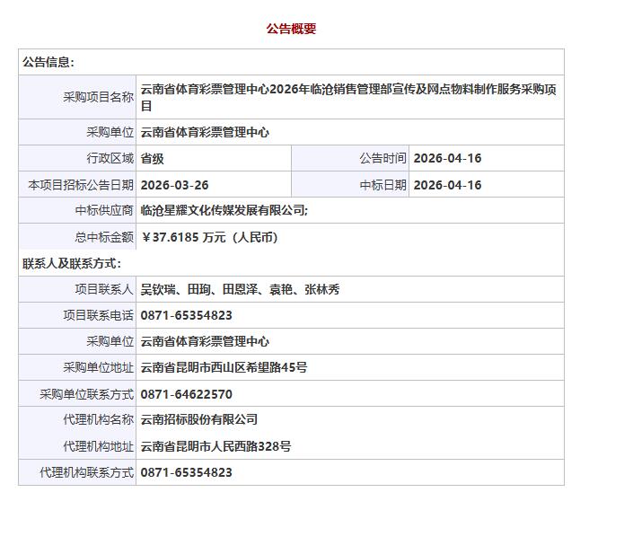 公告链接:云南省体育彩票管理中心2026年临沧销售管理部宣传及网点物料制作服务采购项目中标公告