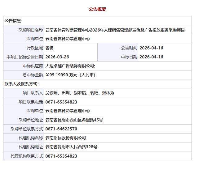 公告链接:云南省体育彩票管理中心2026年大理销售管理部宣传及广告投放服务采购项目中标公告