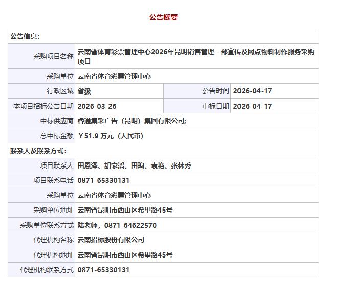 公告链接:云南省体育彩票管理中心2026年昆明销售管理一部宣传及网点物料制作服务采购项目中标公告