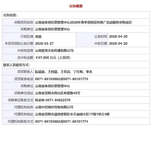 公告链接:云南省体育彩票管理中心2026年春季营销宣传推广活动服务采购项目中标结果公告