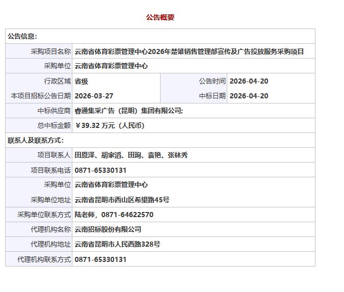 公告链接:云南省体育彩票管理中心2026年楚雄销售管理部宣传及广告投放服务采购项目中标公告