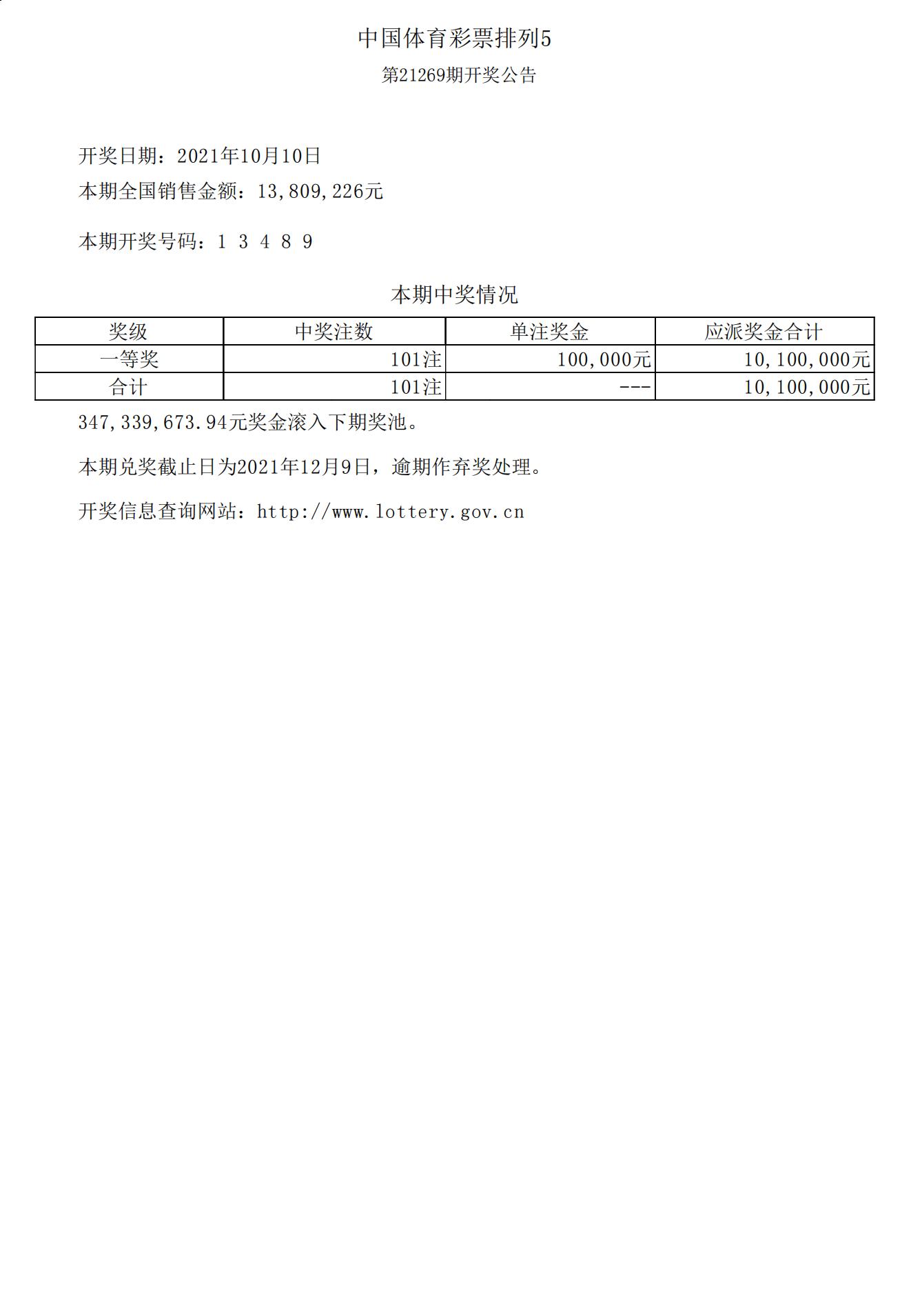 体彩排列5第21269期开奖公告