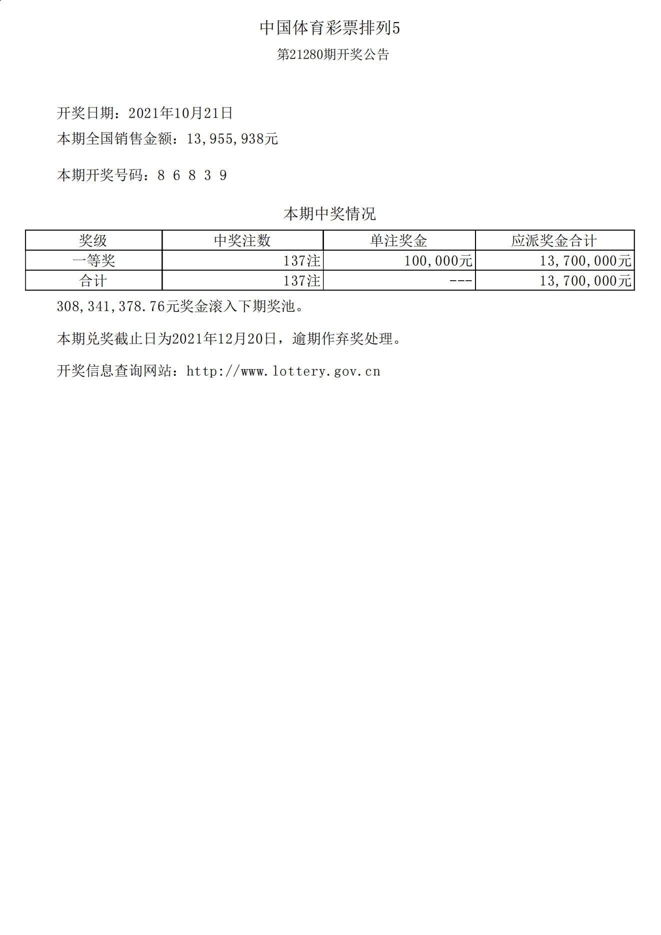 体彩排列5第21280期开奖公告