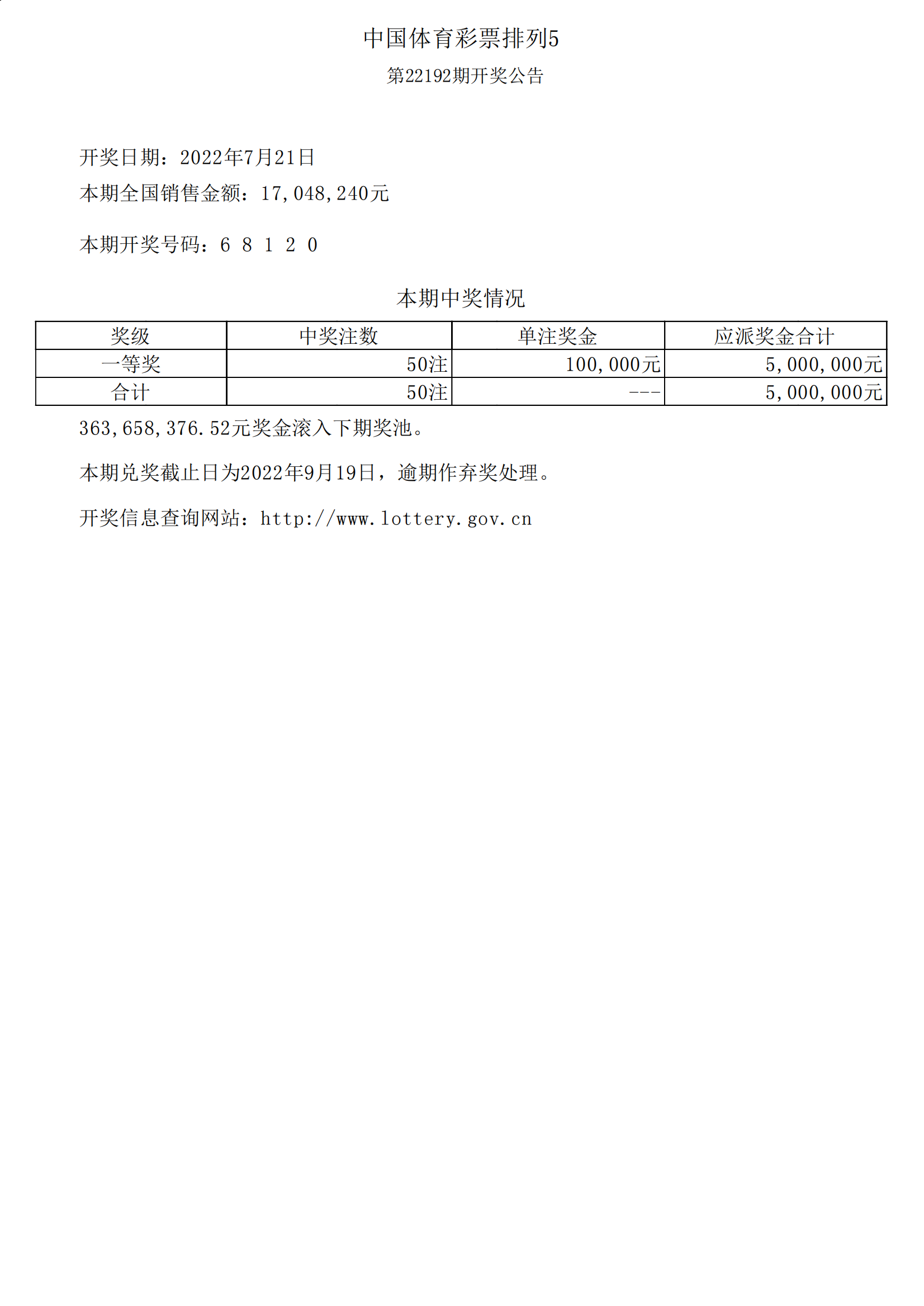体彩排列5第22192期开奖公告