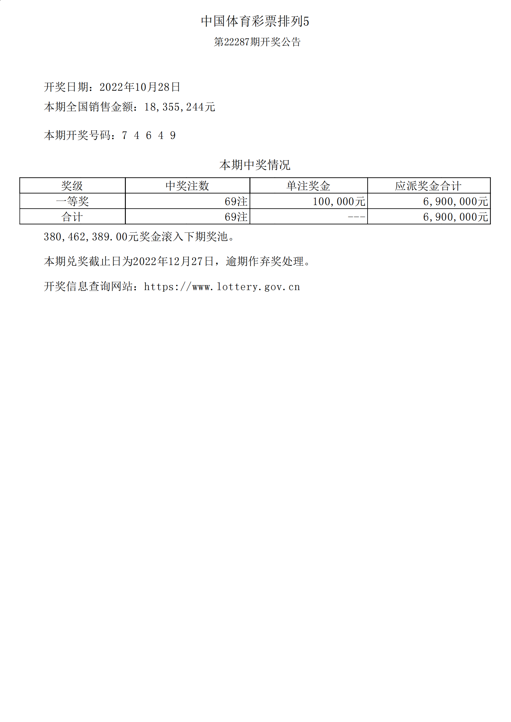 体彩排列5第22287期开奖公告