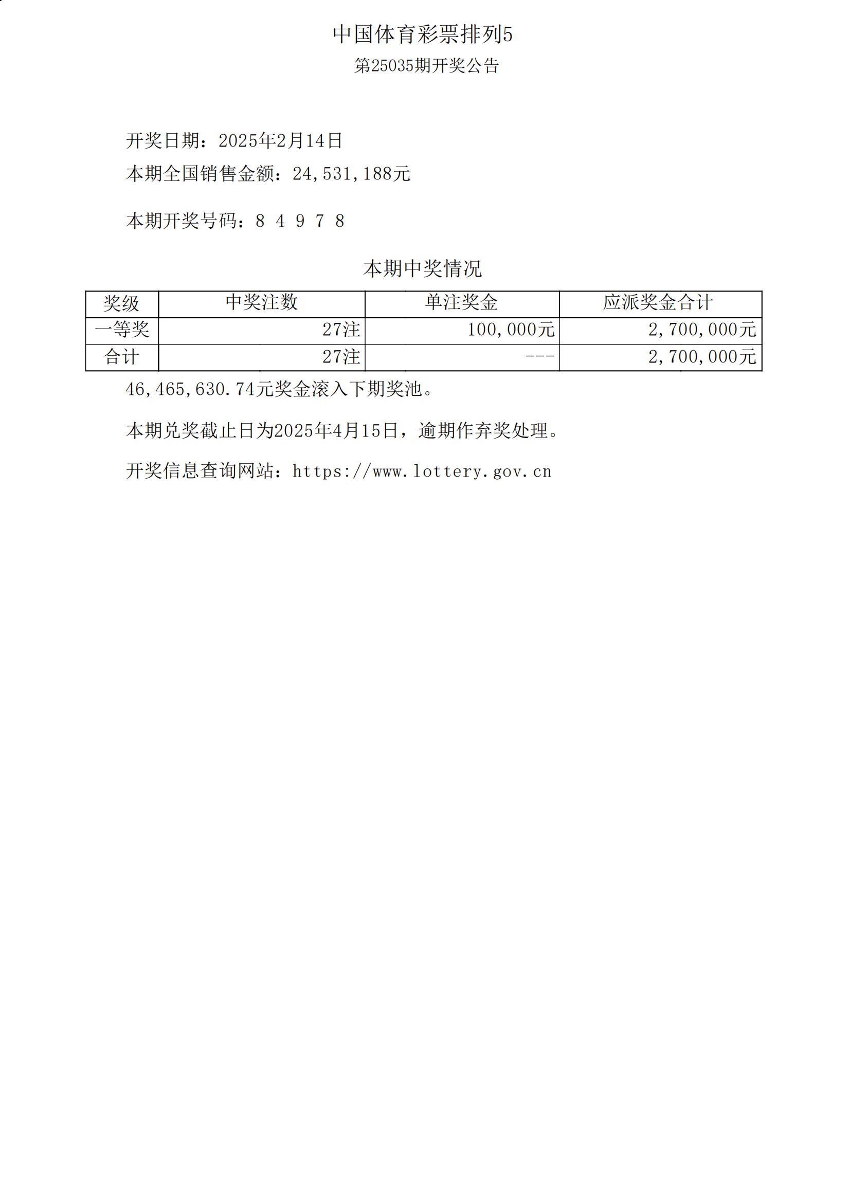 体彩排列5第25035期开奖公告