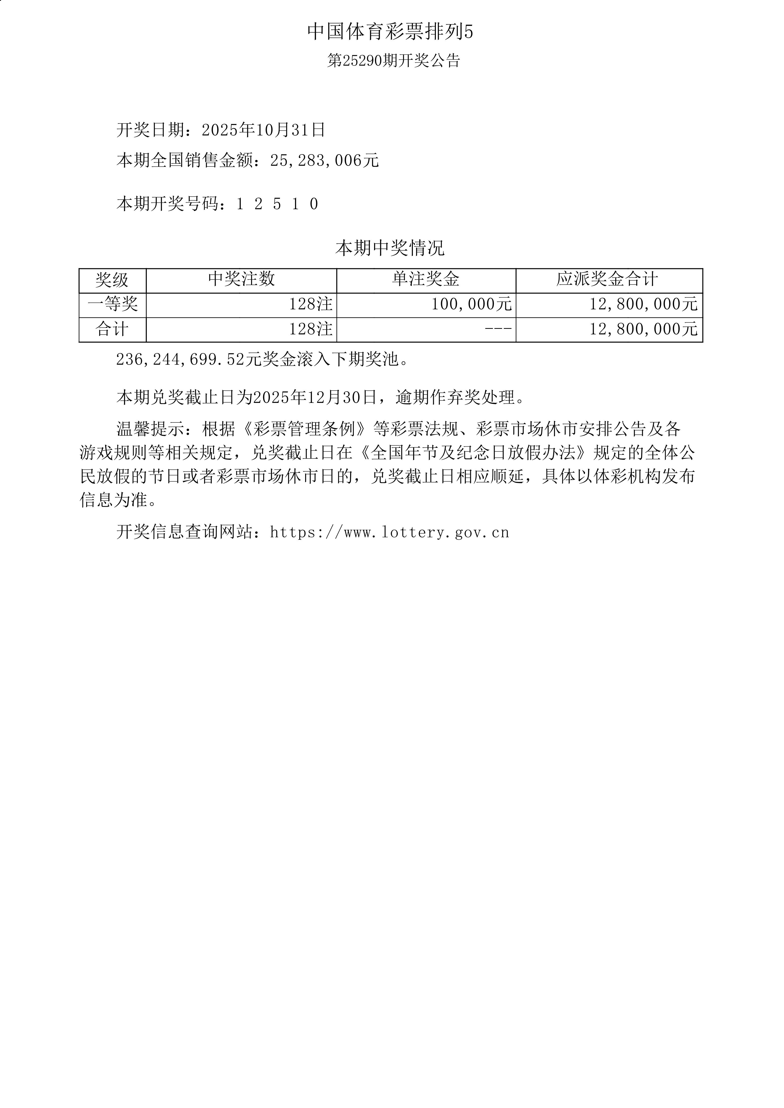 体彩排列5第25290期开奖公告