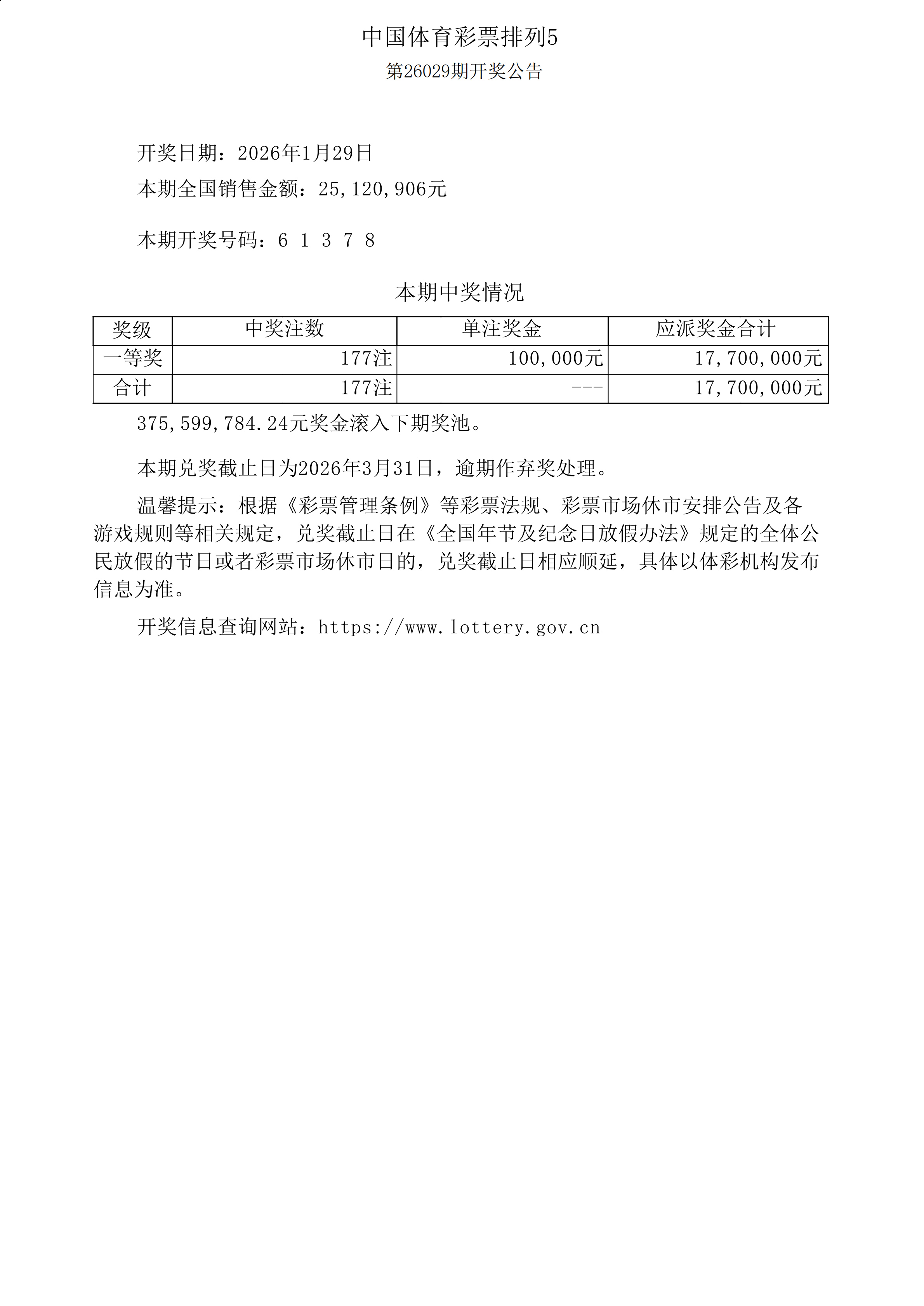 体彩排列5第26029期开奖公告
