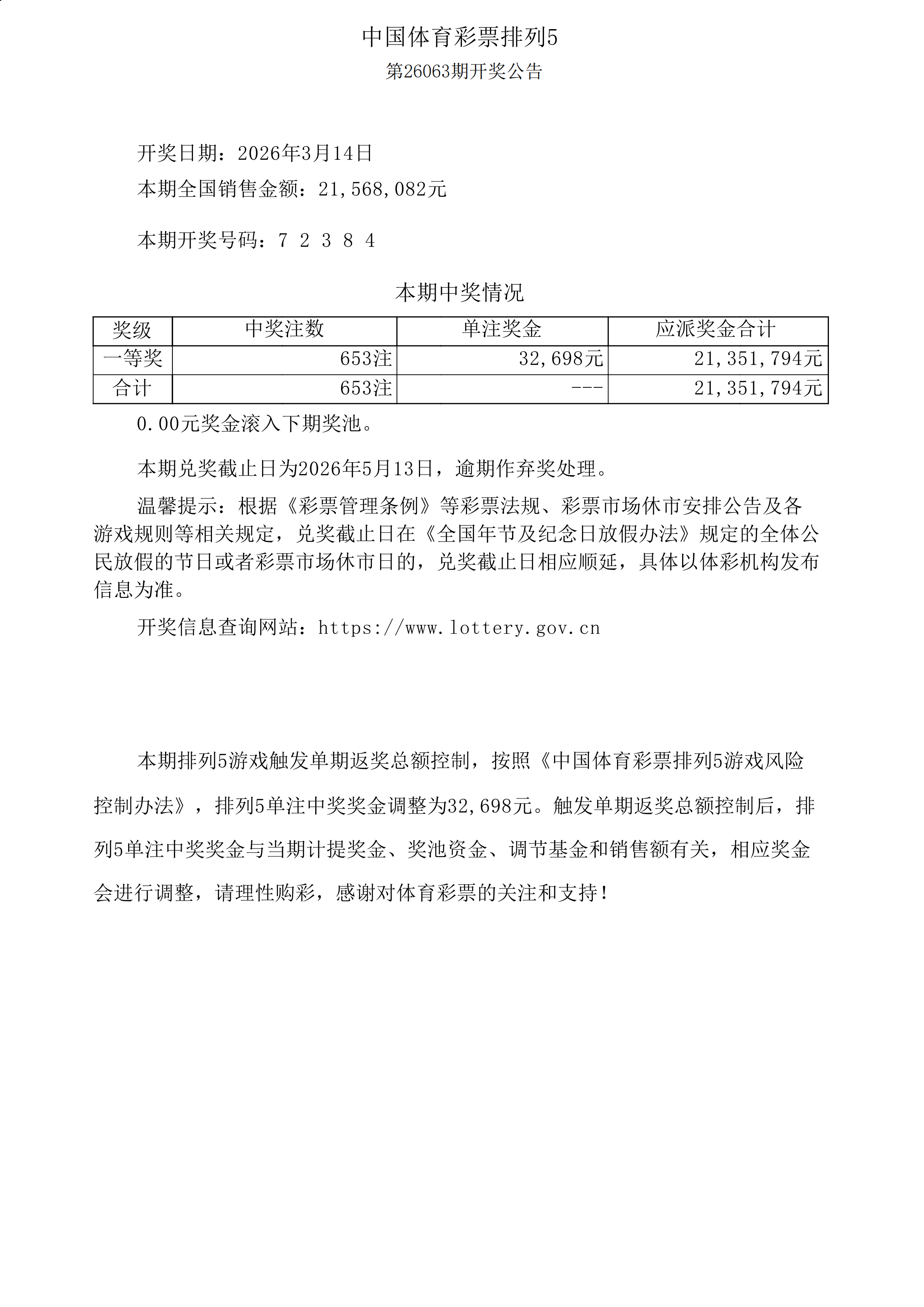 体彩排列5第26063期开奖公告